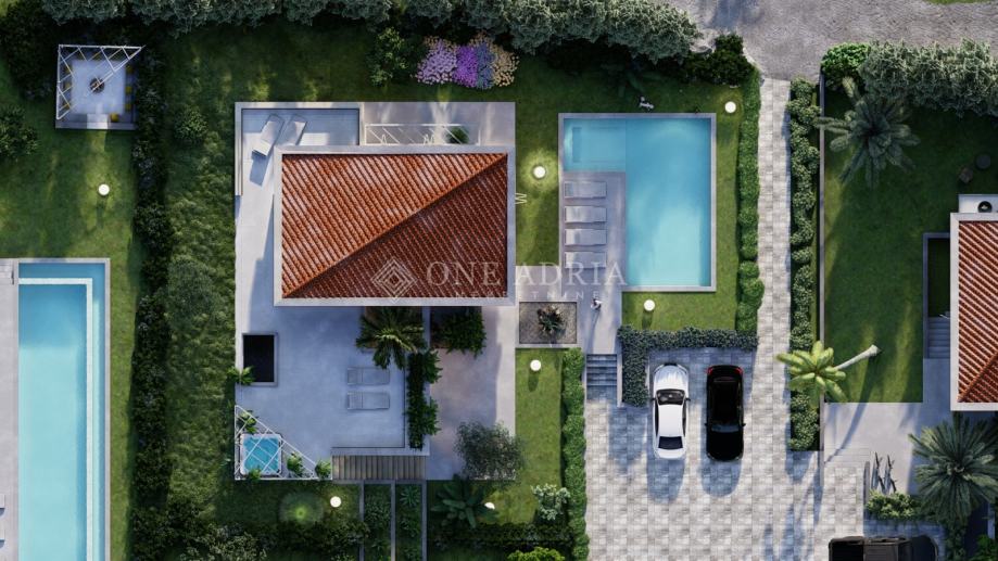 Uređena okućnica obuhvaća bazen površine 40 m², sunčalište i vanjsku kuhinju, stvarajući savršen ambijent za opuštanje i druženja.