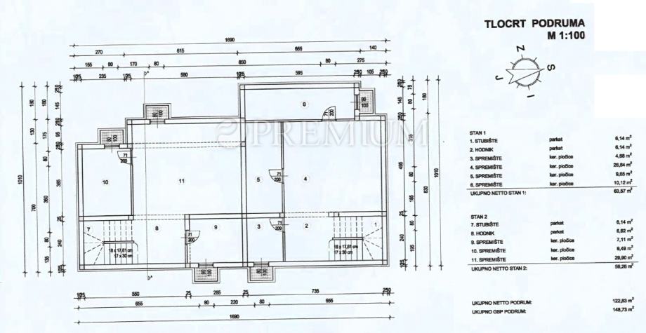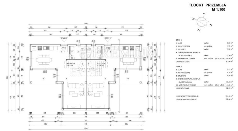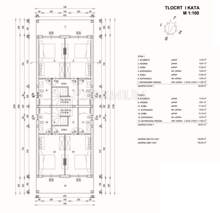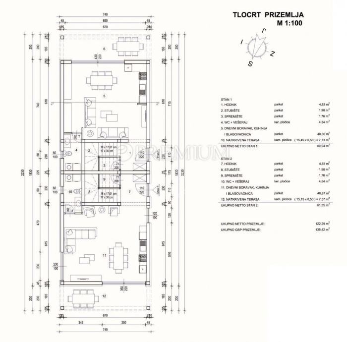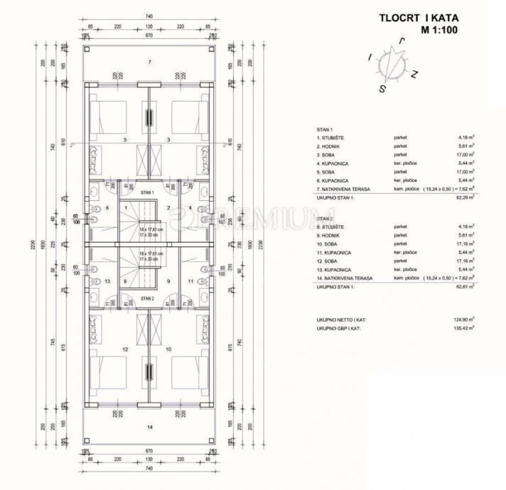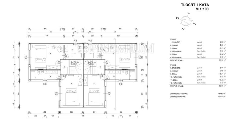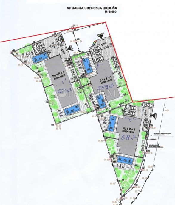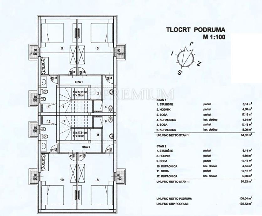 Prema glavnim projektima, svaka kuća sastoji se od podruma, prizemlja i kata, ukupnih površina od 329 do 360 m2, a stambene jedinice imaju od 165 do 187 m2.