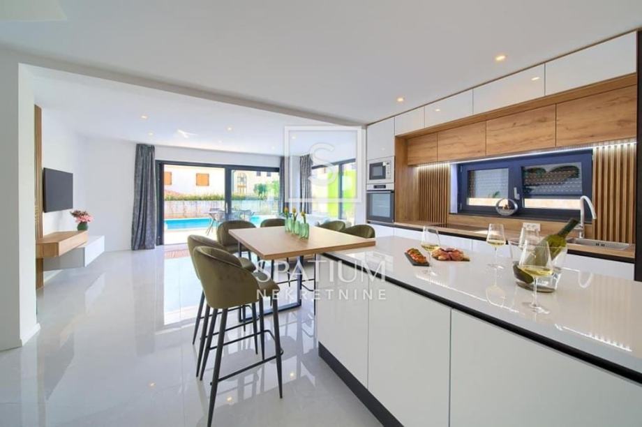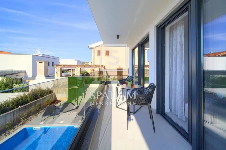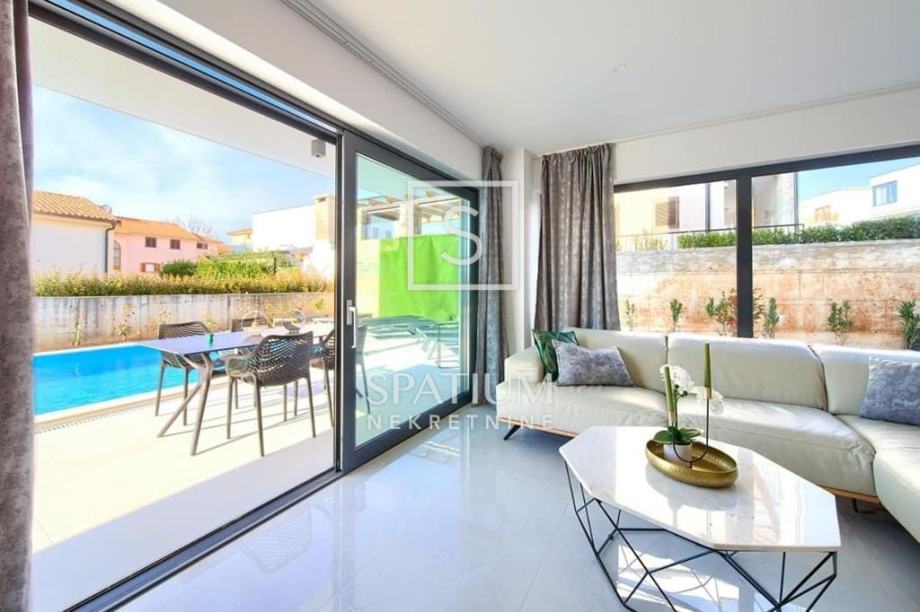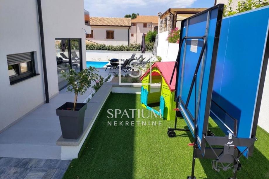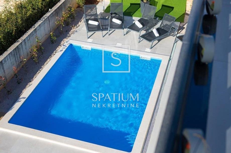 Vanjski dio okućnice ukupne je površine 124,23 m2, parkirno mjesto 12,50 m2 i vanjski bazen od 20,00 m2.
