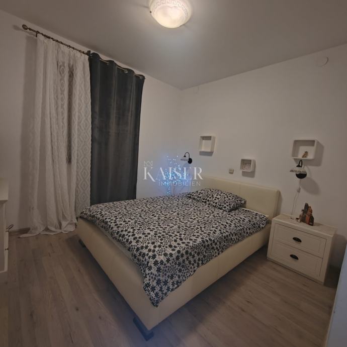 Stan se sastoji od dnevnog boravka s kuhinjom i blagovaonicom, dvije spavaće sobe, kupaonice s tuš kabinom i loggie koja nudi ugodan prostor za opuštanje i boravak na svježem zraku. Interijer je svijetao, prozračan i funkcionalno uređen, s kvalitetnim materijalima i detaljima koji stvaraju ugodan osjećaj doma. Za hladnije dane stan posjeduje i peć na drva i klimu.