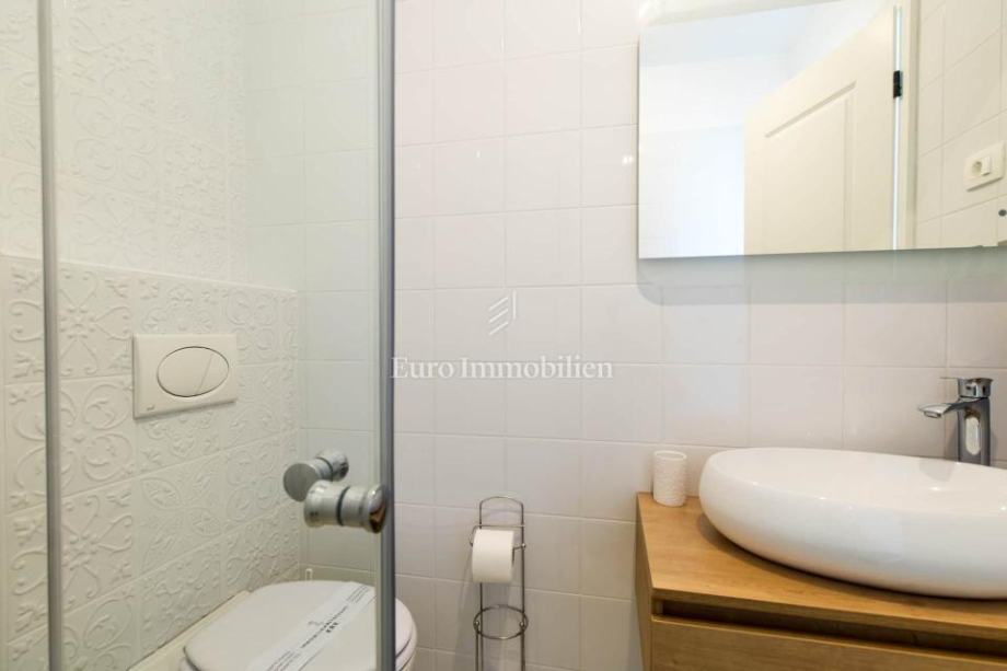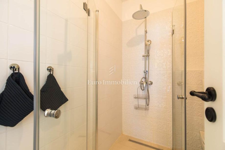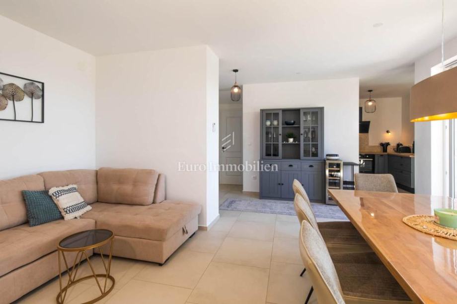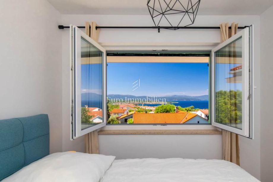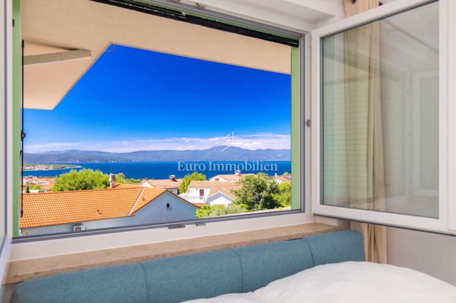 Otok Krk, okolica Malinske, dvojna kuća na prodaju površine 115 m2 s okućnicom površine cca 150 m2. Kuća se sastoji od prizemlja i kata. U prizemlju je dnevni boravak s kuhinjom i blagovaonom, jedna spavaća soba, kupaona i spremište. Na katu su tri spavaće sobe, od kojih jedna ima vlastitu kupaonicu, a druge dvije dijele jednu kupaonu. Na katu se nalazi i terasa s predivnim pogledom na more.