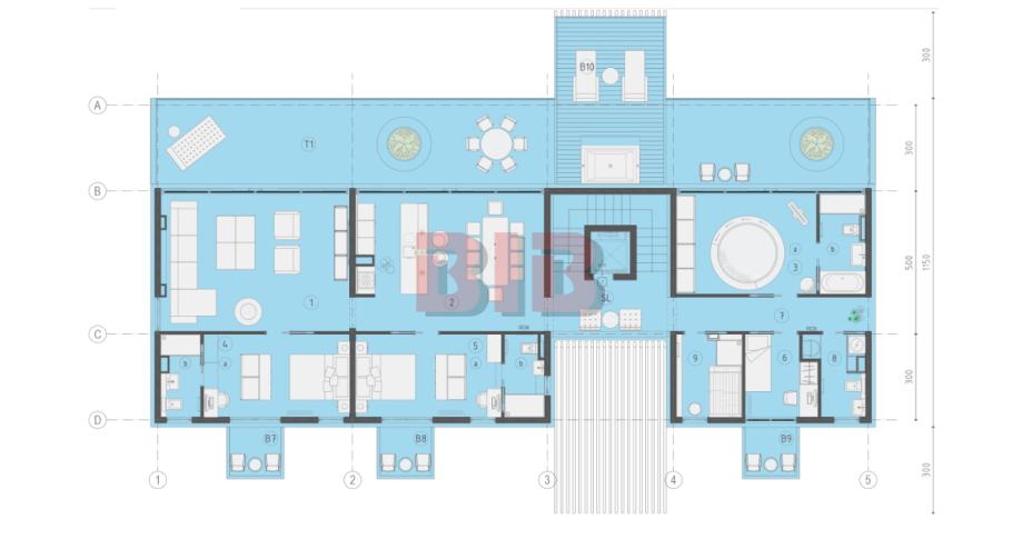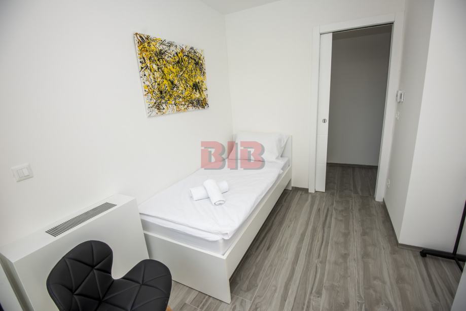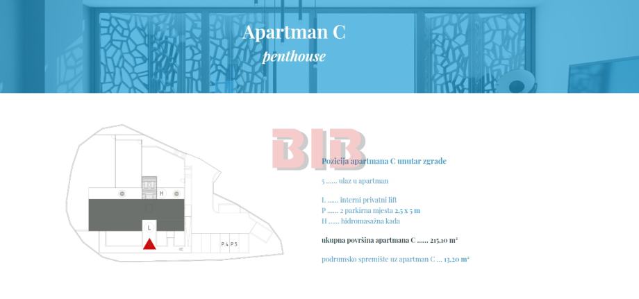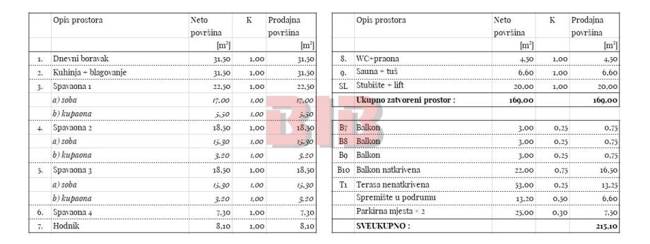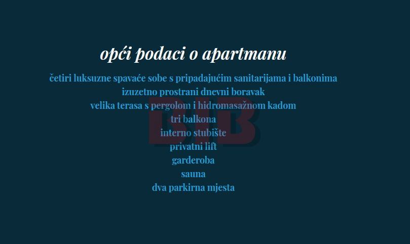 Stan se sastoji od 4 spavaće sobe,4 kupaonice,dnevnog boravka sa kuhinjom i blagovaonom,hodnika,velike terase sa pergolom i hidromasažnom kadom, 4 balkona,saune,wc-a sa praonom,2 spremište i 2 parkinga.
