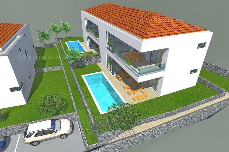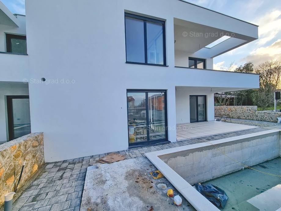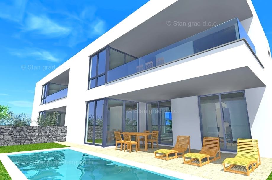 Kod agencije Stan Grad Immobilien na Kvarneru je u prodaji iznimna mediteranska urbana kuća građena po modernom projektu na razvijenom i atraktivnom sjevernojadranskom području otok Krk. Ova privlačna nekretnina se nalazi na izvanrednoj lokaciji blizu centra poznatog turističkog mjesta Malinska. Strukturno, ovo je dvojna kuća katnica. Moderno projektirana kuća obuhvaća koristan prostor na sveukupno 2 etaže. Nekretnina obuhvaća ukupnu površinu od 143 m2. U toj su površini u prizemlju obuhvaćeni ulazni hodnik, wc, spavaća soba, kuhinja s blagovaonicom, dnevni boravak s izlazom na terasu i okućnicu. Na katu navedene nekretnine nalaze se 3 spavaće sobe, svaka sa svojom kupaonicom i izlazom na balkon. Dodanu vrijednost ovom cijelom objektu daje okućnica oplemenjena bazenom i sunčalištem. Dvorište nekretnine obuhvaća mjesto uređeno za komotno parkiranje dva vozila. Uz prethodno, važno je napomenuti da kuća ima vrlo lijep otvoreni pogled na more. Planirani završetak radova očekuje se sredinom 2025. Ova je nekretnina u sustavu PDV-a. Prodavatelj ove kuće jamči kompletnu i urednu dokumentaciju te jednostavan prijenos nekretnine na kupca. Srdačno ćemo vas dočekati na Kvarneru, na adresi našeg ureda na otoku Krku. Osim profesionalnog obilaska i prezentacije nekretnine te njenog pravnog statusa, srdačno osoblje naše agencije će kupcu nekretnine sa zadovoljstvom pomoći u prijenosu vlasničkih prava te prijenosu računa za komunalne usluge na svoje ime.