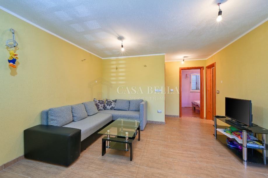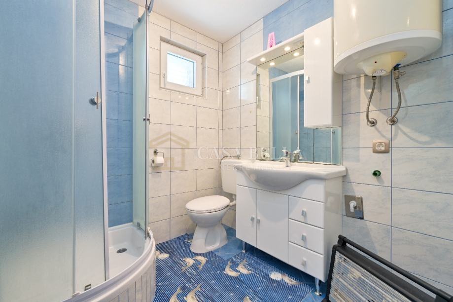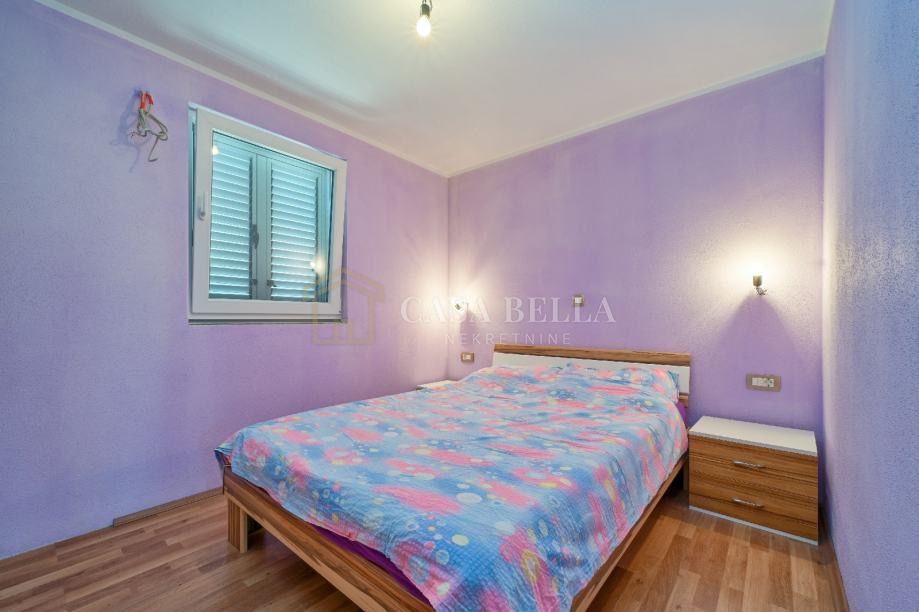 CASA BELLA iz ponude izdvaja kuću od 160m2 koja se sastoji od prizemlja,kata i visokog potkrovlja.Prizemlje je potpuno namješteno te se sastoji od dvije spavaće sobe, kupaonice,izbe,dnevnog boravka,blagavaone i kuhinje. Kat je po sadrzaju isti kao i prizemlje,ali dnevni boravak i sobe ne sadrže namještaj što kupcu daje opciju uređenja po vlastitim željama. Takodjer visoko potkrovlje nije namješteno te ima opciju uređenja kako bi se dobio još jedan lijepi apartman koji bi imao pogled na more. Kuća ima 330m2 okućnice, te prekrasnu natrkivenu terasu koja ima vlastitu vanjsku kuhinju i WC. Dvorište kuće je prostrano te unutar njega može stati 5 automobila.