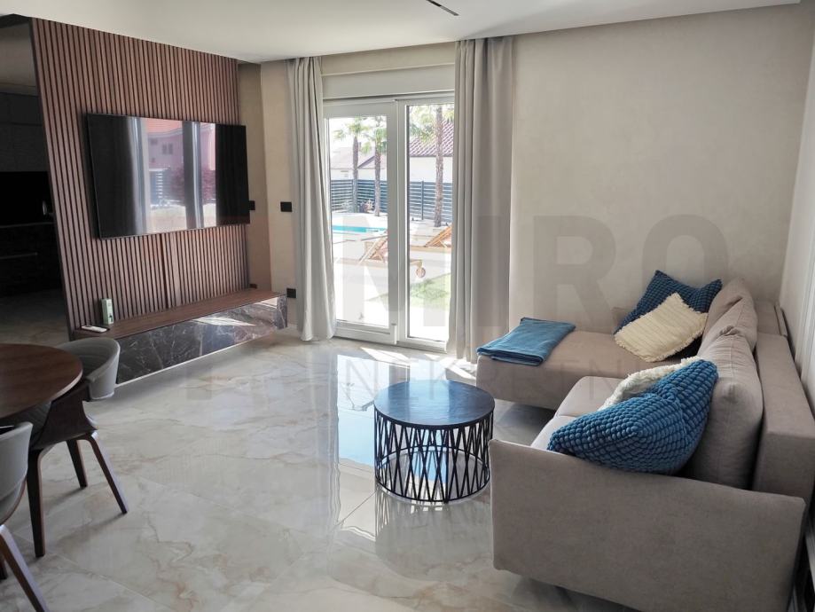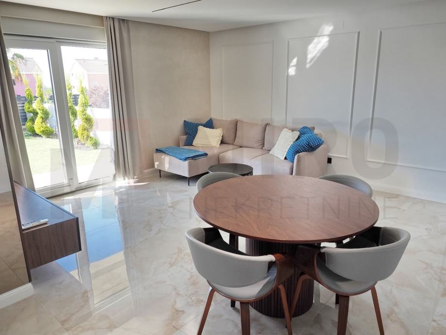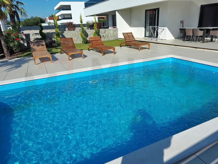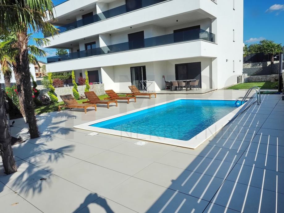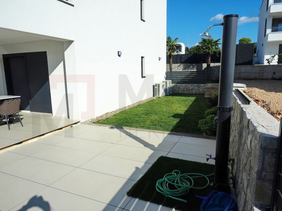 Otok Krk, Malinska u ponudi imamo moderan apartman smješten u prizemlju novogradnje s okućnicom i bazenom. Apartman stambene površine od 70 m2 i sastoji se od ulaznog hodnika, dvije spavaće sobe sa pripadajućim kupaonama, te prostora koji obuhvaća kuhinju, blagovaonu i dnevni boravak sa izlazom na natkrivenu terasu od 19 m2 , lijepo uređena okućnica od 300 m2 na kojoj se nalazi bazen od 28 m2 i sunčalište Pripada mu parkirno mjesto na dvorištu zgrade. Vrhunska gradnja i oprema, PVC stolarija, električne rolete sa komarnicima, podno grijanje, klimatizirani sustav grijanja/hlađenja i novi kvalitetan namještaj rađen po mjeri. Atraktivna lokacija svega 800 m udaljen od mora i plaže. Apartman je u sustavu PDV-a i kupac ne plaća porez na promet nekretnina. Prodavatelj nekretnine jamči urednu vlasničku dokumentaciju. Posjetite nas i pronađite kvadrat vašeg doma!