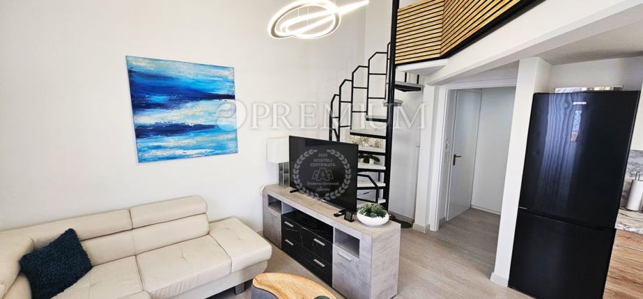 Sastoji se od ulaznog prostora, kupaonice, spavaće sobe, galerije na kojoj se nalazi druga spavaća soba, kuhinje s blagovaonicom i dnevnim boravkom, te izlaza na terasu s prekrasnim panoramskim pogledom na more.