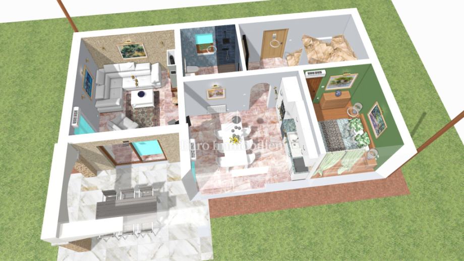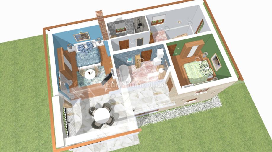 U prizemlju se nalazi otvoreni koncept dnevnog boravka, kuhinje i blagovaonice, hodnik, kupaonica, jedna spavaća soba te spremište. Prizemlju pripada i prostrana natkrivena terasa.