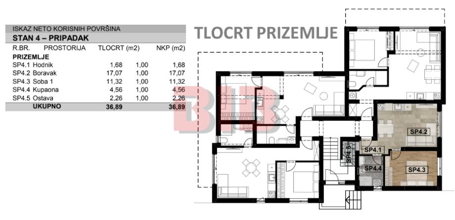 Stan se sastoji od dvosobnog stana sa dnevnim boravkom površine 79,17m2 na II katu,koji se sastoji od hodnika,dnevnog boravka,kuhinje sa blagovaonicom,2 spavaće sobe, kupaonice,wc,balkona i natkrivene terase ,te jednosobnog stana u prizemlju površine 36,89 m2,koji se sastoji od hodnika,dnevnog boravka sa kuhinjom,spavaće sobe,kuhinje i ostave