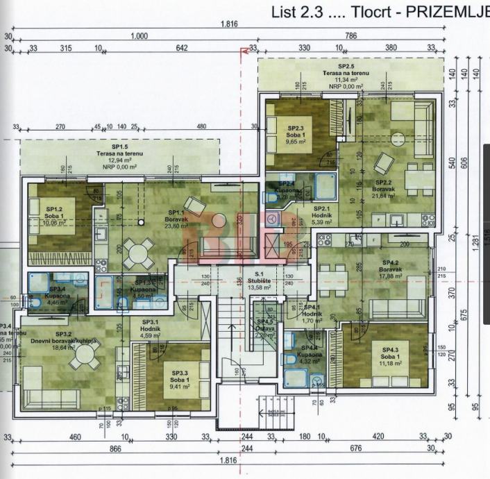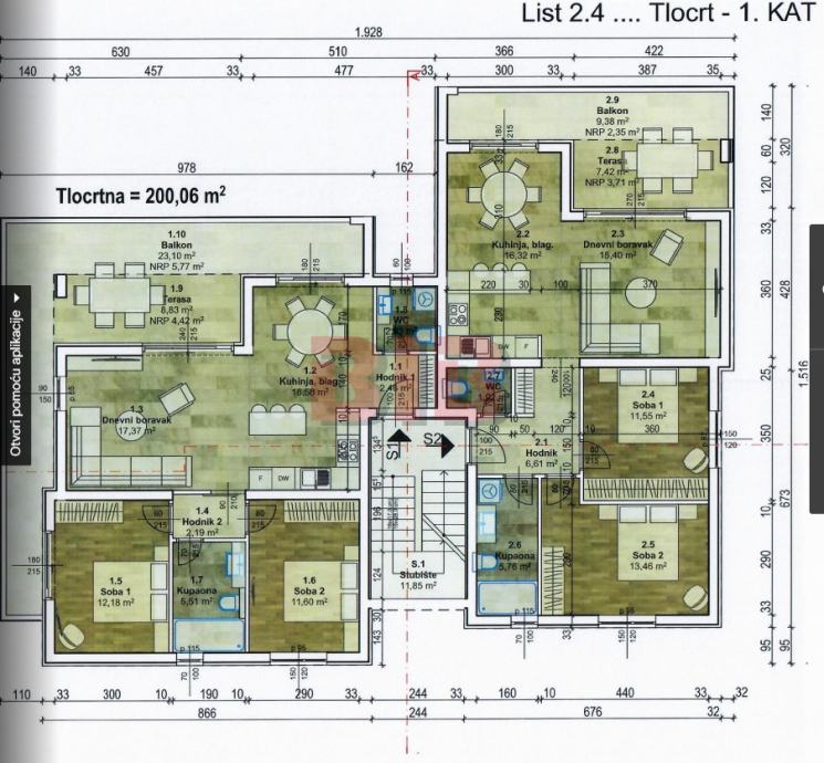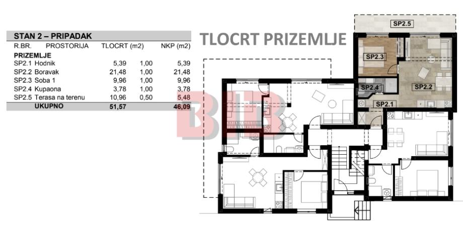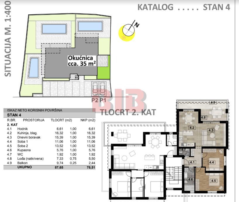 Stan se sastoji od dvosobnog stana sa dnevnim boravkom površine 78,50m2 na I katu,koji se sastoji od hodnika,dnevnog boravka,kuhinje sa blagovaonicom,2 spavaće sobe, kupaonice,wc,balkona i natkrivene lođe ,te jednosobnog stana u prizemlju površine 46.09 m2,koji se sastoji od hodnika,dnevnog boravka sa kuhinjom,spavaće sobe,kuhinje i terase