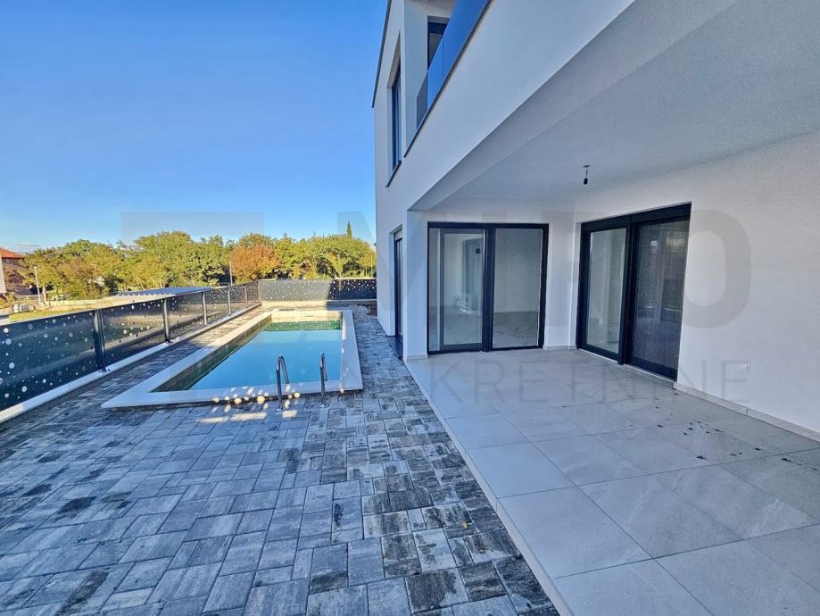 Otok Krk, Malinska, prodaje se dvojna kuća u novogradnji s bazenom i okućnicom. Nekretnina ima površinu 200 m2 a proteže se na prizemlje i kat. U prizemlju su predsoblje, garderoba, soba kupaonica i veliki otvoreni prostor koji objedinjuje dnevni boravak, kuhinju i blagovaonicu te natkrivena terasa površine 15 m2. Na katu se nalaze hodnik, garderoba, tri spavaće sobe, svaka sa svojom kupaonicom i dva balkona i krovna terasa. Kuća se prodaje po sistemu ključ u ruke s uređenom okućnicom od 350m2, bazenom i dva parkirna mjesta. Kvalitetna gradnja s podnim grijanjem po sistemu toplinske pumpe, PVC stolarija s roletama, klimatizacija svih prostorija. Useljenje se planira na ljeto 2024.godine. Nekretnina je u sustavu PDV i novi vlasnik je oslobođen plaćanja poreza u visini od 3 %. Vlasnik kuće jamči urednu vlasničku dokumentaciiju. Posjetite nas i pronađite kvadrat vašeg doma!
