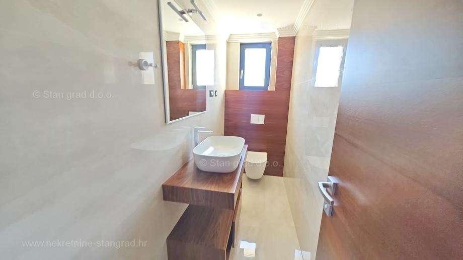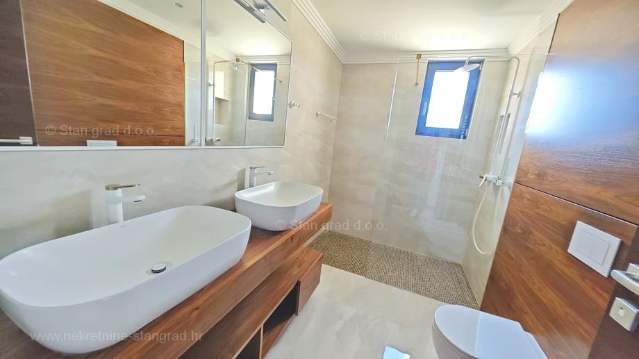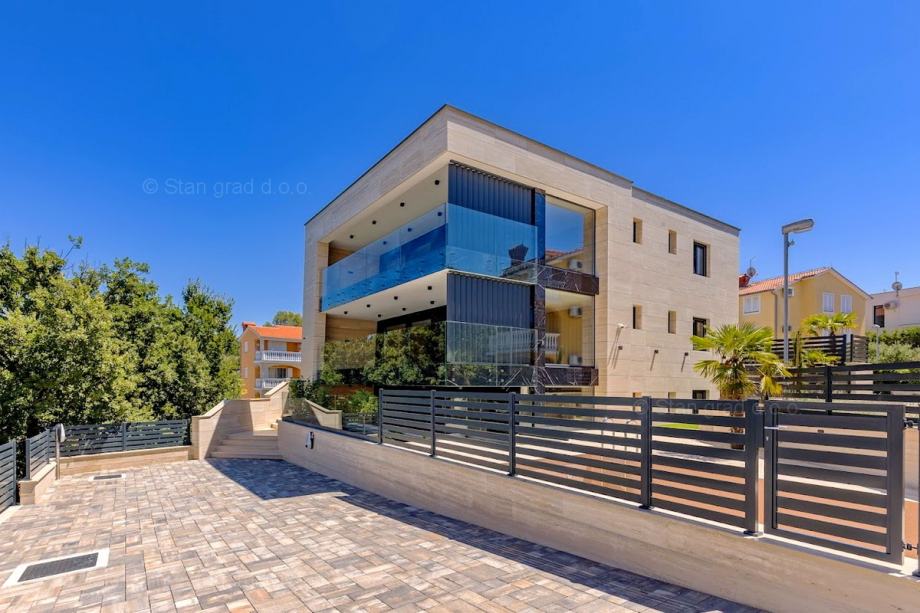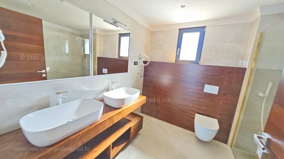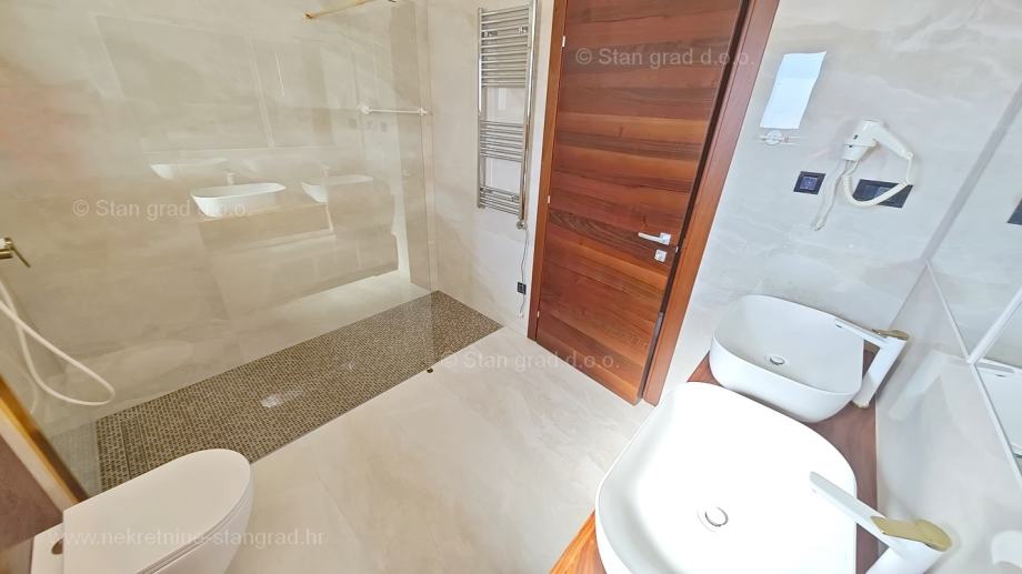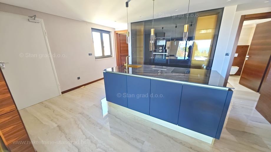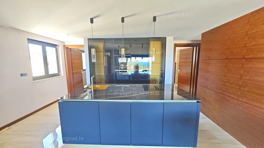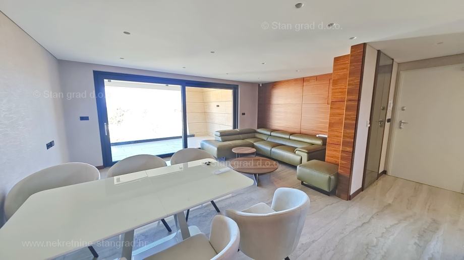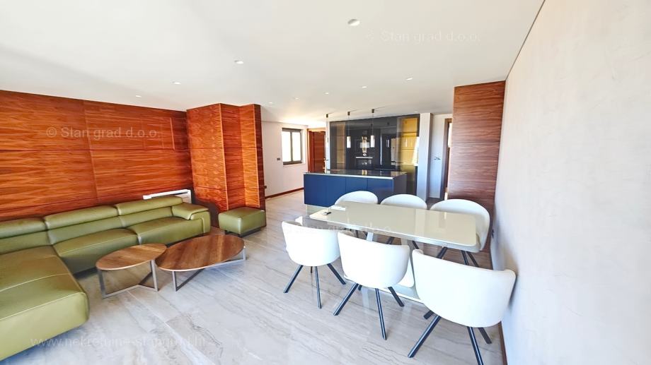 Prema vrsti, ovo je prostrani jednoetažni apartman koji se prostire preko cijele etaže objekta. U prvoklasno građenom objektu, apartman je pozicioniran na 2. etaži od ukupno tri stambene jedinice. Ukupna površina pokrivena apartmanom iznosi približno 120 m2. Sastoji se od ulaznog prostora, wc-a, kupaonice, tri spavaće sobe, od kojih master spavaća ima svoju kupaonicu, prostranog dnevnog boravka s kuhinjom i blagovaonom s izlazom na natkrivenu terasu. Unutrašnji prostor nekretnine je kompletno opremljen najsuvremenijim dizajnerskim namještajem Mitsubishi klimatizaciju, podno grijanje, podizno-kliznu stolariju, porculan keramiku, protuprovalna vrata Diere, sobna vrata od orah drva i vanjsku fasadu od rimskog kamena Travertin.