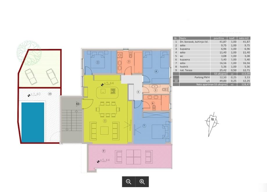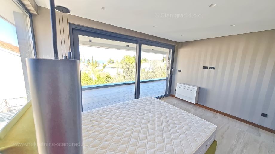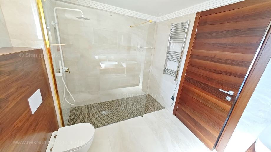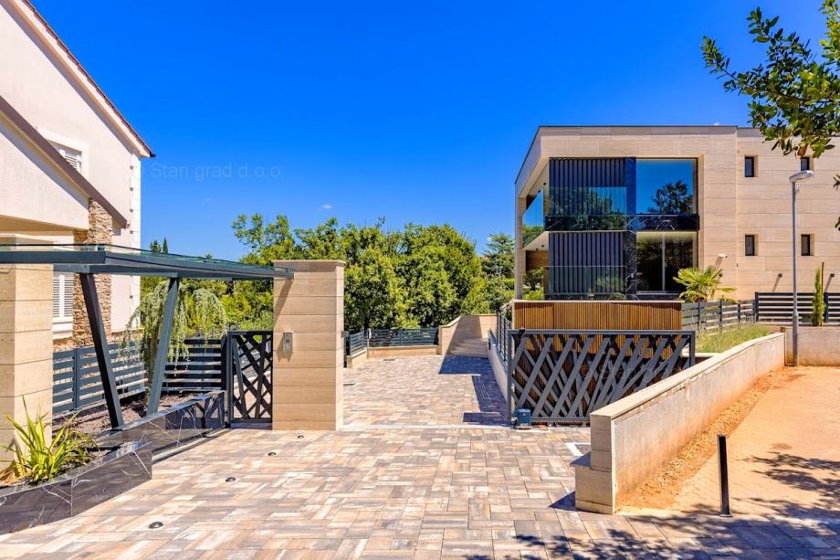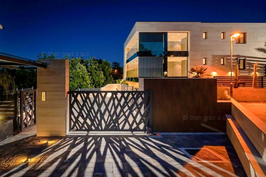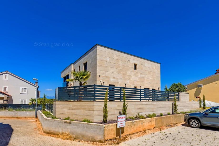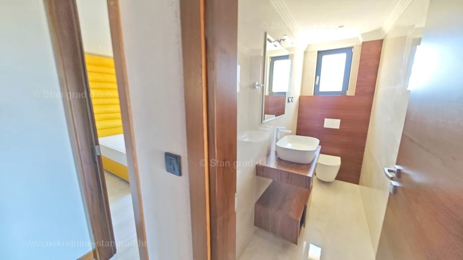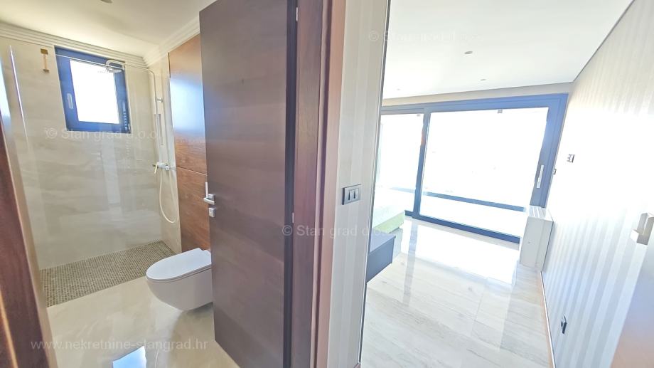 Prema vrsti, ovo je prostrani jednoetažni apartman koji se prostire preko cijele etaže objekta. U prvoklasno građenom objektu, apartman je pozicioniran na 2. etaži od ukupno tri stambene jedinice. Ukupna površina pokrivena apartmanom iznosi približno 120 m2. Sastoji se od ulaznog prostora, wc-a, kupaonice, tri spavaće sobe, od kojih master spavaća ima svoju kupaonicu, prostranog dnevnog boravka s kuhinjom i blagovaonom s izlazom na natkrivenu terasu. Unutrašnji prostor nekretnine je kompletno opremljen najsuvremenijim dizajnerskim namještajem Mitsubishi klimatizaciju, podno grijanje, podizno-kliznu stolariju, porculan keramiku, protuprovalna vrata Diere, sobna vrata od orah drva i vanjsku fasadu od rimskog kamena Travertin.