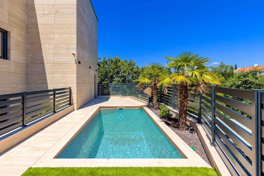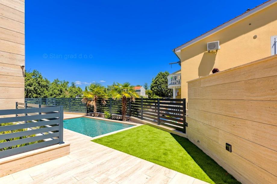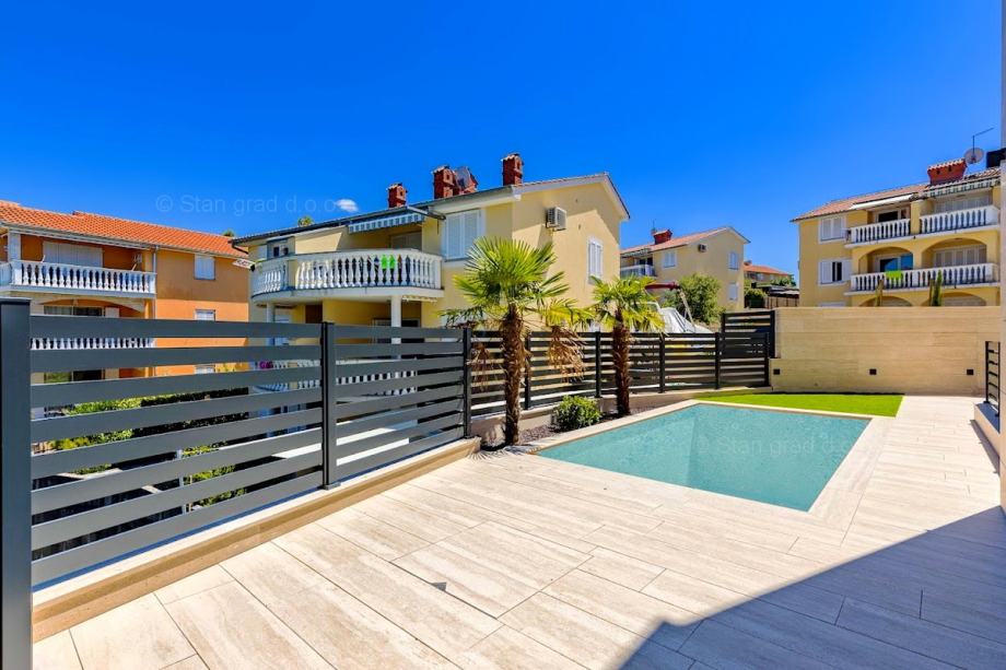U okviru vlasništva opisane nekretnine treba osobito istaknuti lijepo izvedenu okućnicu kojoj posebnu draž i vrijednost donosi bazen i uređeni prostor za opuštanje od cca. 75 m2. Vlasnik apartmana na raspolaganju će imati jedno parkirno mjesto. Povrh navedenih značajki, ovaj je apartman vrlo dobro orijentiran i nudi lijep pogled na more i primorje.