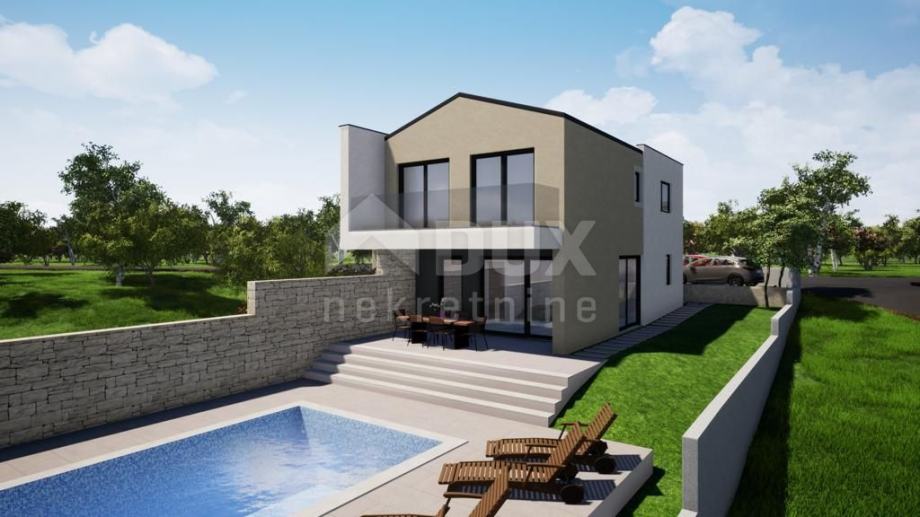 Kuća se sastoji od prizemlja i kata. Prizemlje se sastoji od ulaznog prostora, ostave, kupaonice te prozračnog otvorenog prostora kojeg čine kuhinja sa blagovaonicom i dnevnim boravkom. Dnevni boravak ima pristup natkrivenoj terasi te bazenu sa sunčalištem. Na katu se nalaze tri spavaće sobe, dvije kupaonice i natkrivena terasa sa lijepim pogledom na more. Na okućnici veličine 220 m2 nalazi se bazen veličine 34 m2 sa sunčalištem i dva parkirna mjesta. Visoka kvaliteta gradnje i opreme, a standardna oprema uključuje vrhunsku keramiku i sanitarije, podno grijanje te klimatizaciju.