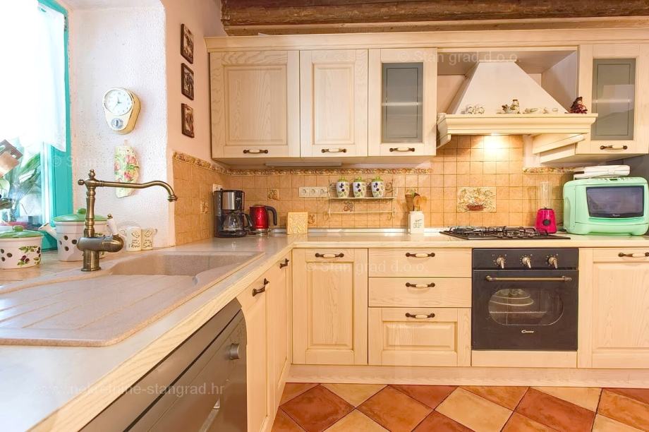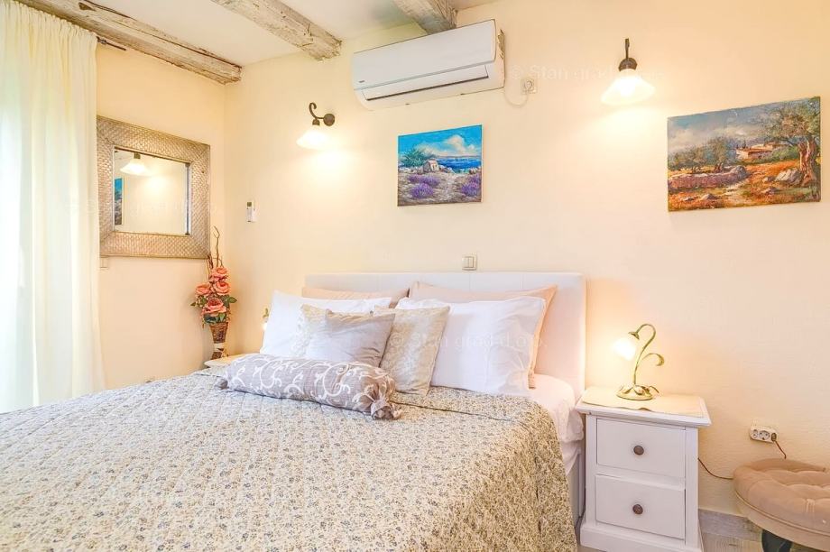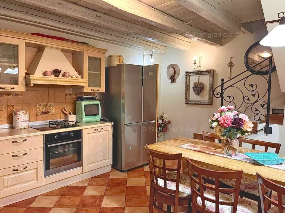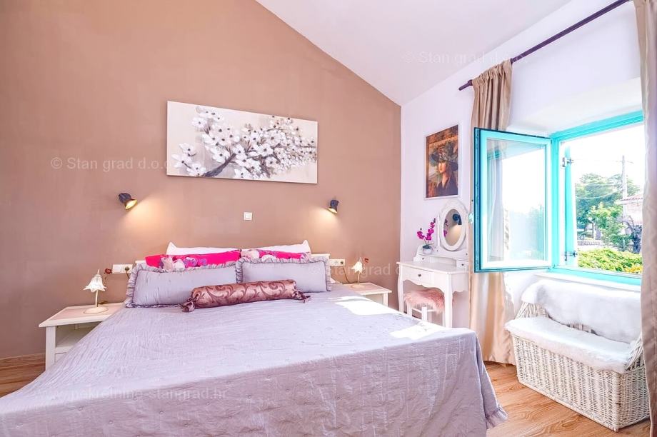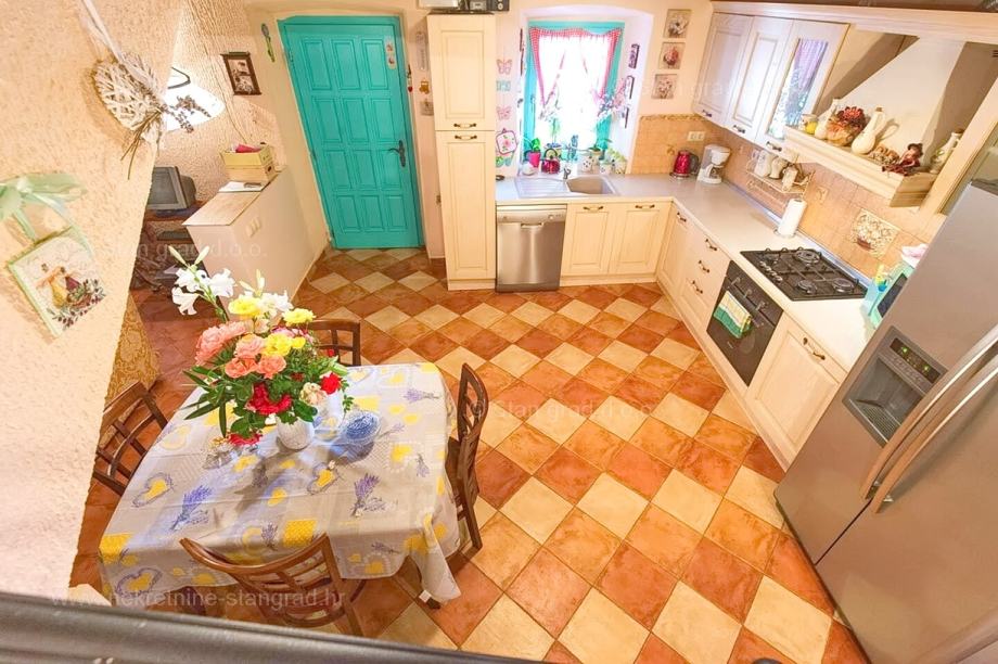 Na prodaju kod naše agencije na Kvarneru je stavljena vrlo vrijedna i skupocjeno građena kuća za odmor na poznatom i atraktivnom jadranskom turističkom području otok Krk. Ova je kuća pozicionirana na mirnoj lokaciji u okolici primorskog mjesta Malinska, ne predaleko od mora. Gledajući strukturno, ovo je samostojeća kuća katnica s pomoćnim objektom površine cca 50 m2. Besprijekorno izvedena nekretnina sastavljena je od ukupno 2 etaže. Površina ove kuće iznosi ukupno 180 m2. Ovom površinom su u prizemlju obuhvaćeni dnevni boravak i kuhinja s blagovaonicom, toalet, spavaća soba opremljena kupaonicom s jacuzzijem, spremište i izlaz na natkrivenu terasu od 50 m2. Spiralnim stepeništem od kovanog željeza dolazi se na prvi kat na kojem se nalazi dječja soba i glavna spavaća soba koja ima vlastitu kupaonicu. U izvanredno održavani i raskošno namješteni interijer predmetne nekretnine je instaliran bogati set uređaja novije generacije. Dodanu vrijednost ovom cijelom objektu daje okućnica oplemenjena bazenom i sunčalištem. Također kuća ima konobu od 60 m2 i više natkrivenih terasa idealnih za druženje. Pomoćni objekt se sastoji od kuhinje, blagovaonice, galerije, kupaonice, konobe i wc-a. Prostrana okućnica opisane nekretnine uređeno je komotno parkiranje više vozila. Uz prethodno, nije zanemarivo kazati da kuća ima lijep pogled na šumu i prirodno raslinje. Predmetna je kuća u vlasništvu fizičke obveze i kod prijenosa vlasništva podliježe obračunu poreza na promet nekretnina u visini 3%. Prodavatelj nekretnine garantira brz prijenos vlasničkih prava te urednu vlasničku i tehničku dokumentaciju. Najavite se i rado ćemo vas primiti u našem uredu na otoku Krku. Odlučite li se za nas, stručni tim posredničkog ureda Stan Grad Immobilien će vam sa zadovoljstvom pomoći kod prijenosa vlasništva nekretnine i računa za komunalne priključke na svoje ime.