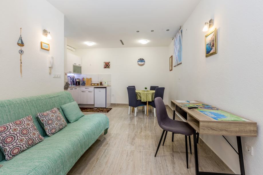 Poseban ugođaj pruža prostrana okućnica površine oko 80 m², oplemenjena lijepom drvenom sjenicom – savršenim kutkom za uživanje na otvorenom tijekom cijele godine, bez obzira na vremenske prilike. Apartman također ima vlastito parkirno mjesto, što dodatno povećava komfor i funkcionalnost.