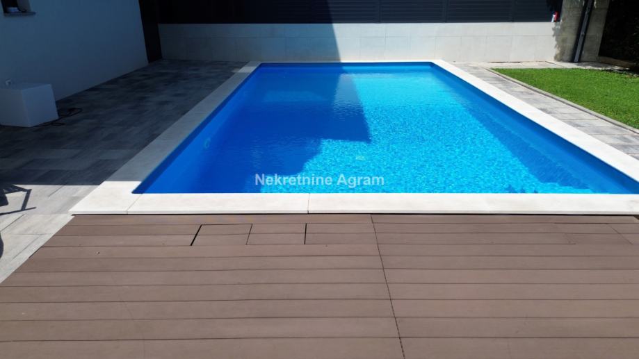 PRIZEMLJE: ulazni hall ,dnevni boravak sa kuhinjom i blagovaonom,garderoba, kupaona, bazen (8x4m),okućnica-predvrt od 133 m2 i parkirno mjesto ( mogućnost više parkirnih mjesta)
