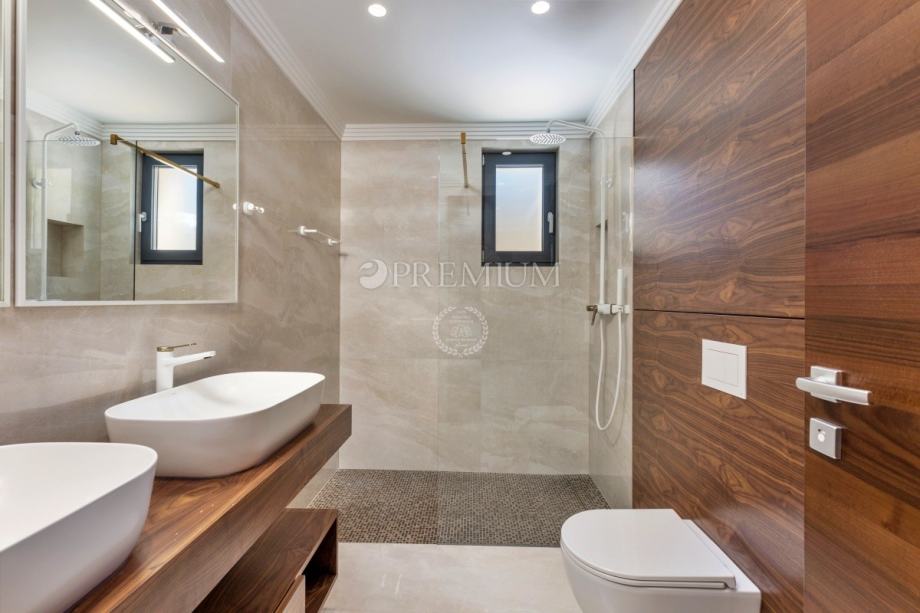 Ovu modernu i ekskluzivnu novogradnju karakterizira odličan raspored prostorija, ALU stolarija, kvalitetne sanitarije, parket, porculanska keramika, klimatizacija svih soba, podno grijanje, rimski kamen na ETICS fasadi, debljine 15 mm.