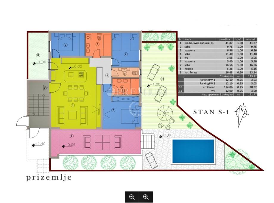 Neto površine 113 m2, sastoji se od ulaznog prostora, wc-a, kupaonice, tri spavaće sobe, od kojih master spavaća ima svoju kupaonicu, prostranog, open space dnevnog boravka s kuhinjom i blagovaonom s izlazom na natkrivenu terasu i okućnicu od 178 m2, gdje je smješten i bazen sa sunčalištem.