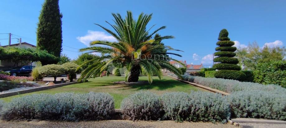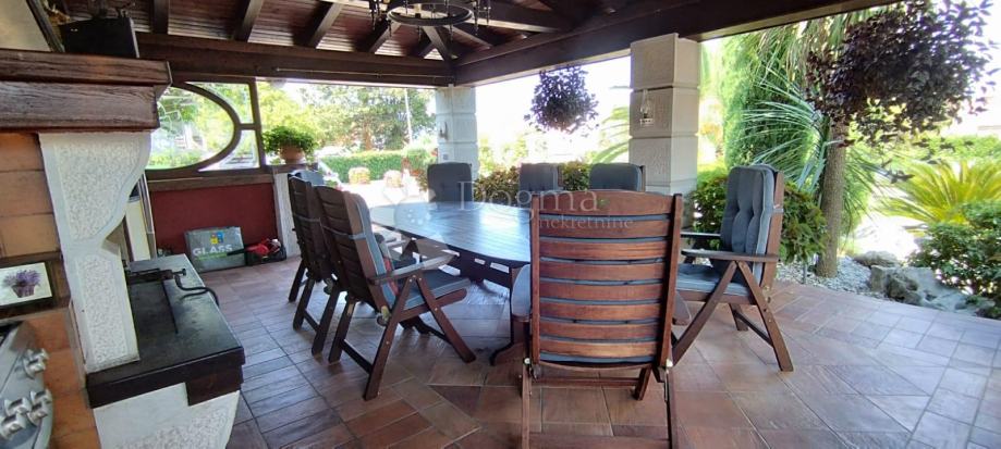 Nekretnina je dodatno opremljena s tri garaže, dok okućnica, ukrašena dekorativnim zelenilom, nudi kameni roštilj, vrtnu kućicu i sjenicu.