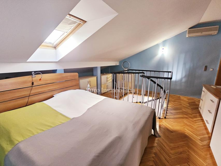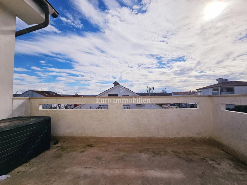 Na prodaju je prostran i funkcionalan stan smješten u mirnom dijelu Malinske. Stan se nalazi na drugom katu i u potkrovlju višestambene zgrade, ukupne podne površine 108 m². Donja etaža sastoji se od ulaznog prostora, kupaonice, kuhinje s blagovaonicom i dnevnog boravka otvorenog koncepta. Iz dnevnog boravka izlazi se na terasu s pogledom na more. U potkrovlju, do kojeg se pristupa spiralnim stepenicama, nalaze se tri spavaće sobe i dodatna kupaonica.
