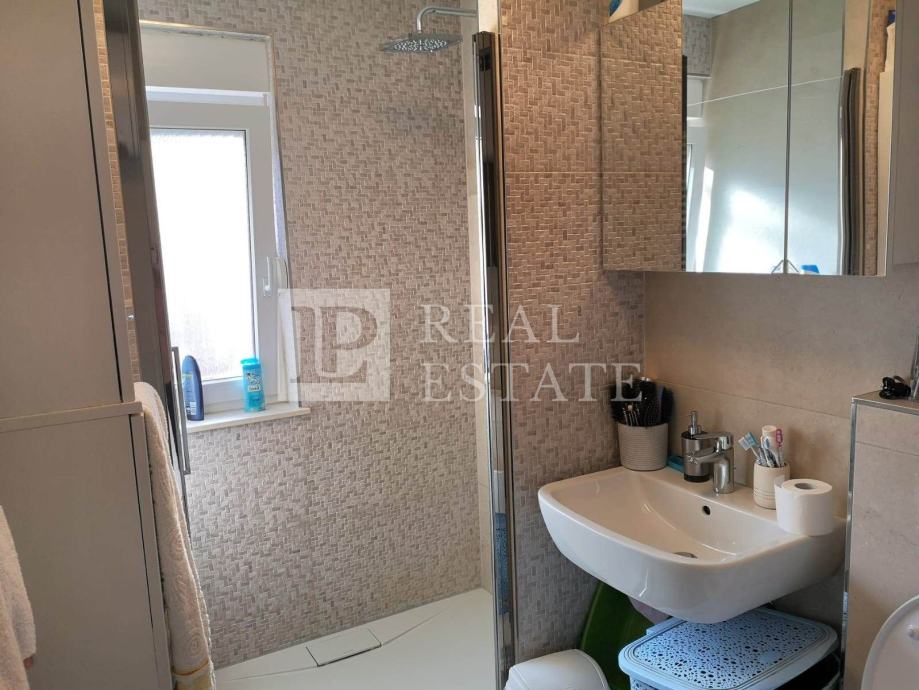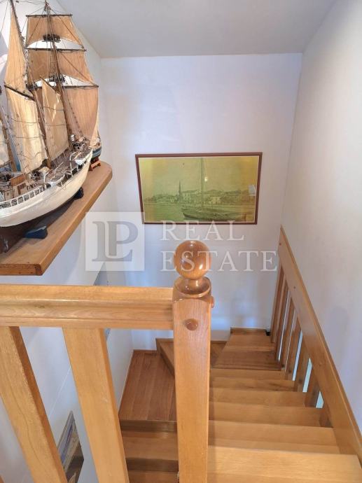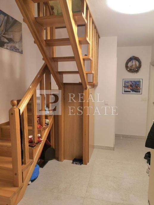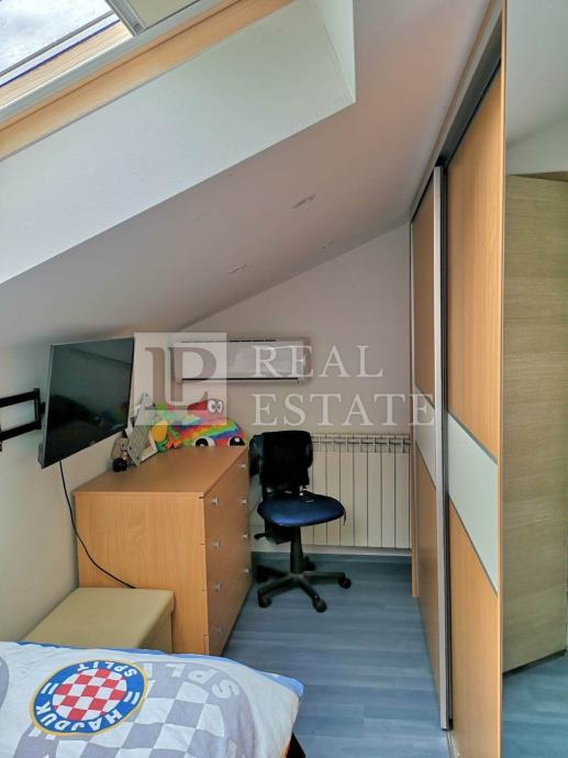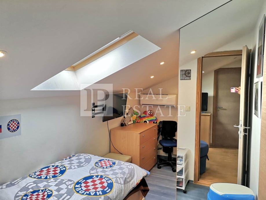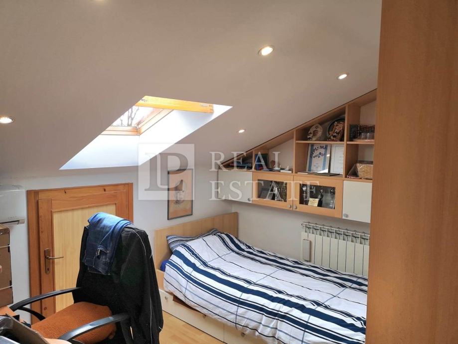 Unutarnjim stepenicama se dolazi do potkrovlja u kojemu su smještene još tri spavaće sobe, WC i kotlovnica, tako da stan u naravi ima 110 m2.