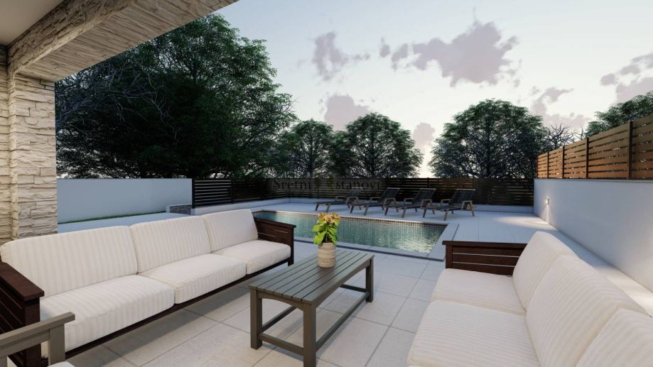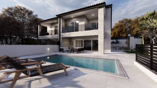 Luxury villa with pool on the island of Krk, in Sveti Vid - Malinska. New construction that can be moved into by the summer of 2025. Semi-detached house, ground floor and first floor (P+1), floor plan area 199.87 m2. The house with a swimming pool is located on a plot of 510 m2 and has its own 2 parking spaces. The size of the pool is 22m2 (6.4m x 3.4m). On the ground floor of the house there is a living room with a terrace, a corridor, a toilet and a storage room. Upstairs there are 3 bedrooms, each with its own bathroom and terrace. All rooms are air-conditioned /Toshiba and the entire villa has underfloor heating. SPC floors, top-quality light ceramics in the bathrooms, beautiful interior doors and excellent joinery. Beautiful seaview, nice, quiet location only 1,5 kilometers from the first beaches and city centar.. Clean ownership and proper construction papers.
