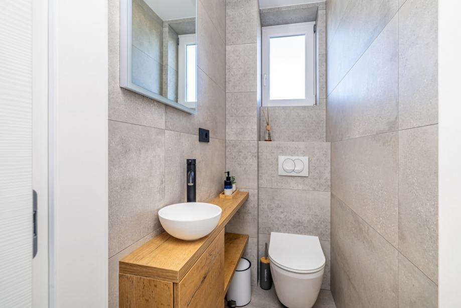 Interijer je pažljivo uređen s kvalitetnim materijalima i detaljima koji odišu elegancijom. Svaka prostorija obiluje prirodnim svjetlom zahvaljujući velikim prozorima i otvorenom konceptu. Dodatan bonus je tavansko spremište, savršeno za odlaganje stvari.