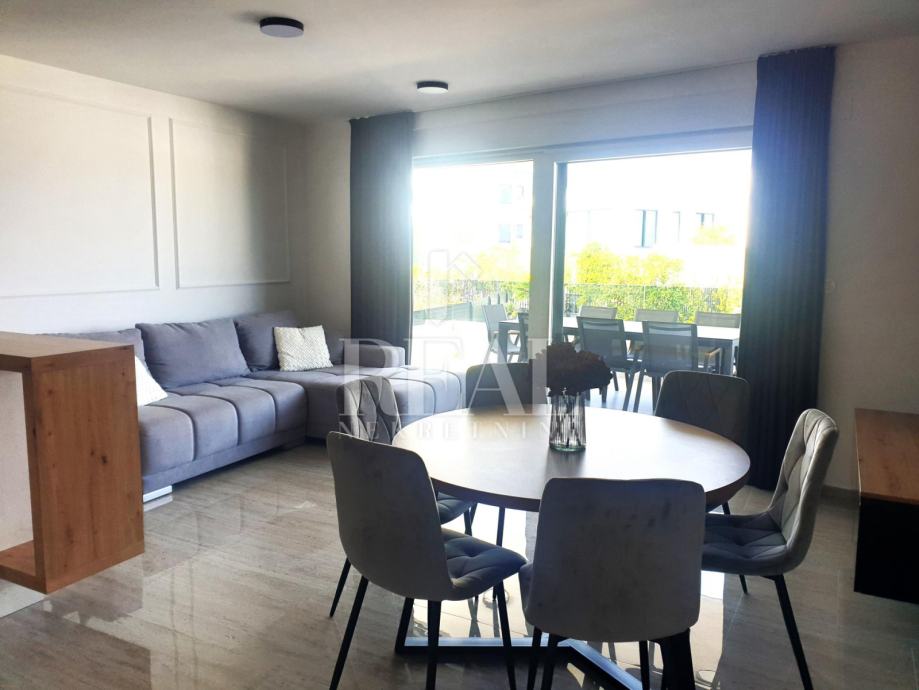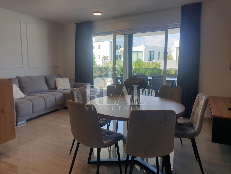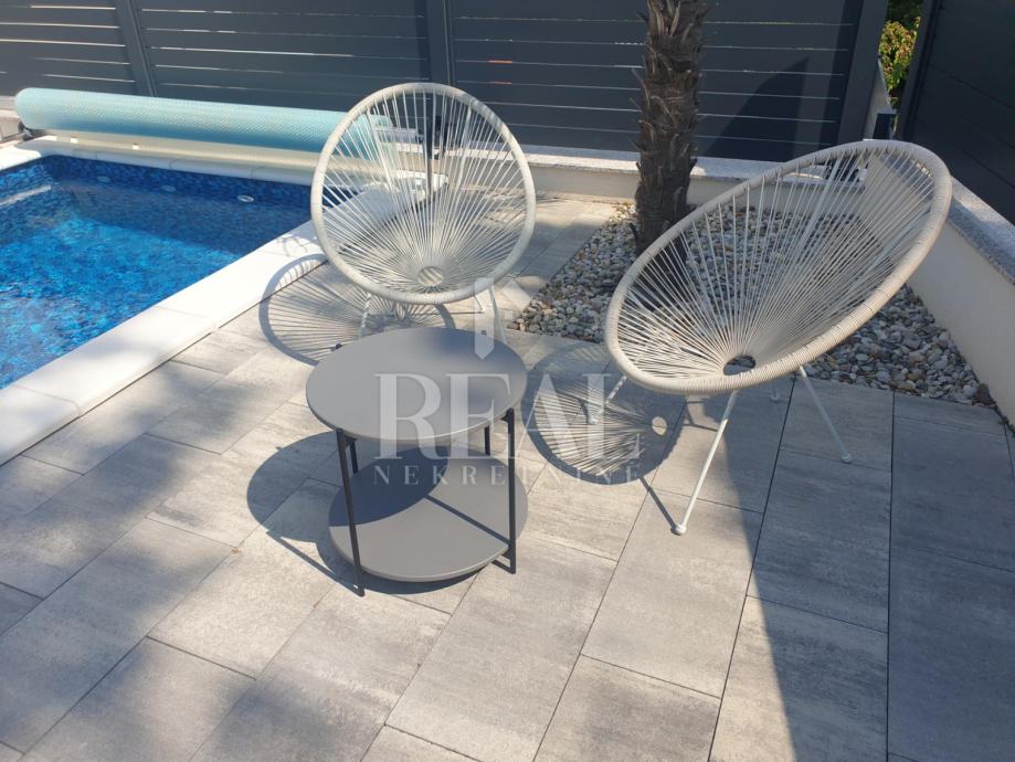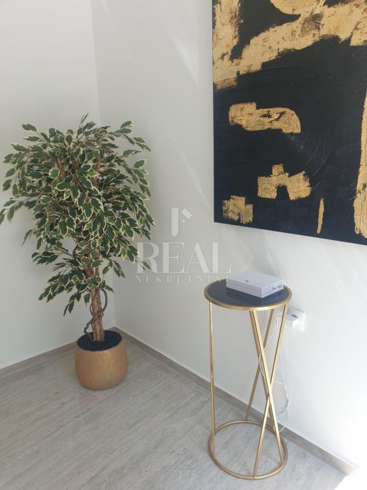 Stan se prodaje kompletno namješten i opremljen. Valja istaknuti kuhinju sa kvalitetnim elektičnim aparatima, a od opreme podno grijanje i klimatizaciju svih prostorija, kvalitenu podne i zidne podloge i sanitarije, te potpuno automatizirani i grijani bazen.