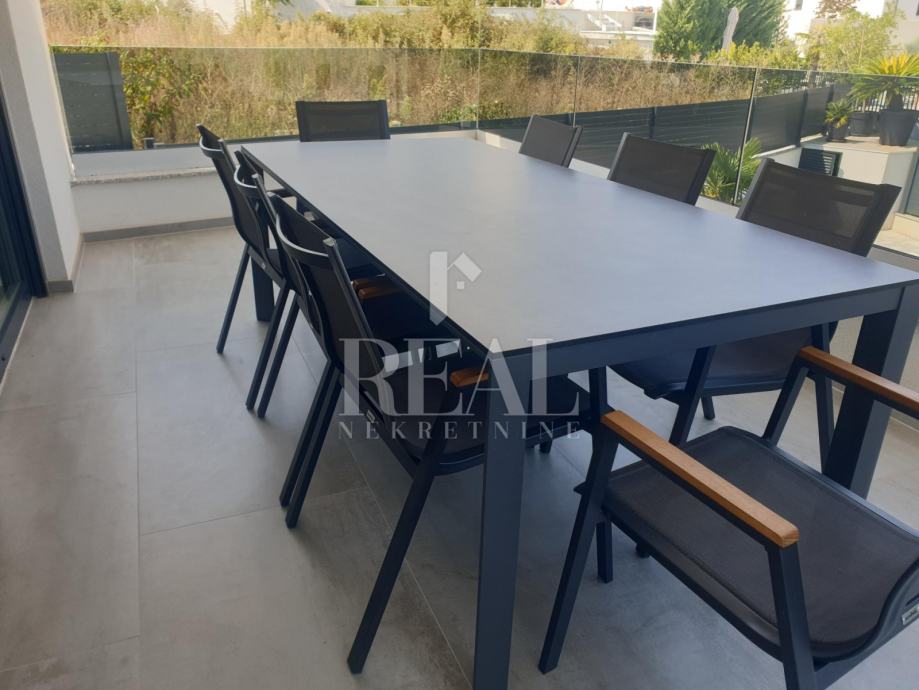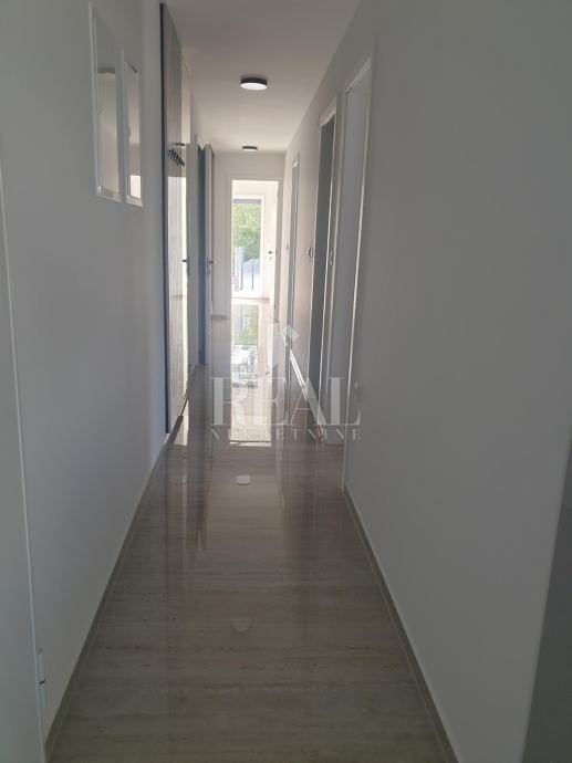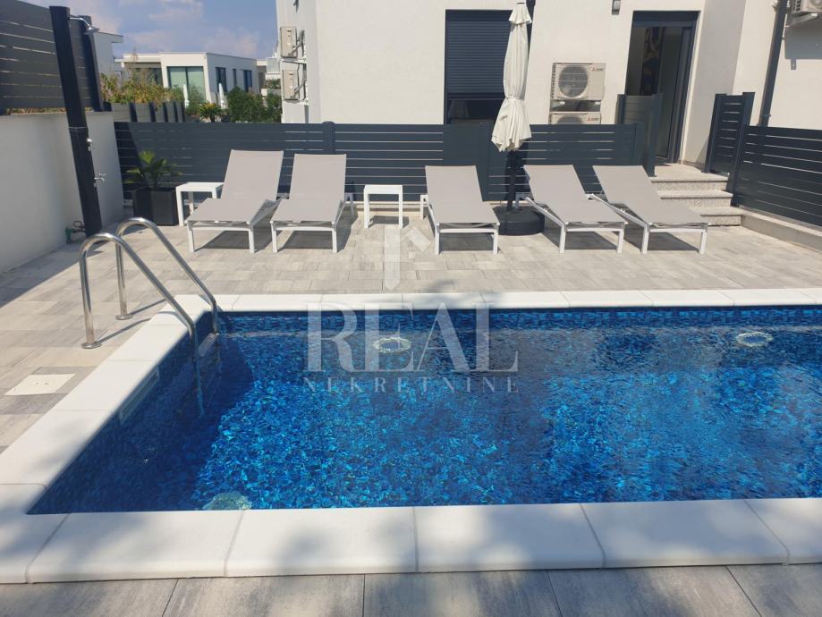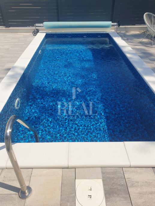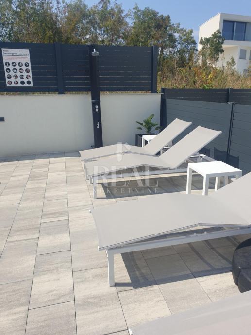 Stan je smješten na prvom katu urbane vile. Pripadaju mu dva parkirna mjesta i okućnica od 67 m2. Na njoj je smješten bazen sa sunčalištem, strojarnica bazena i manja ljetnja kuhinja.