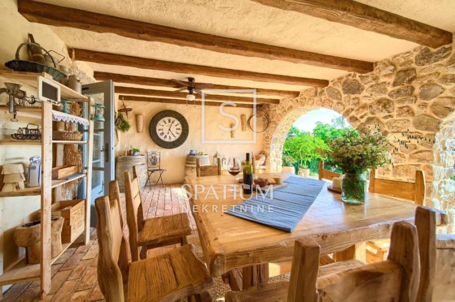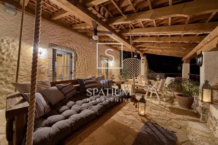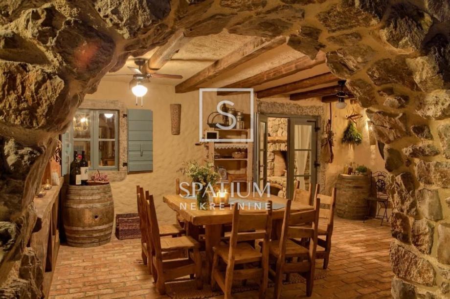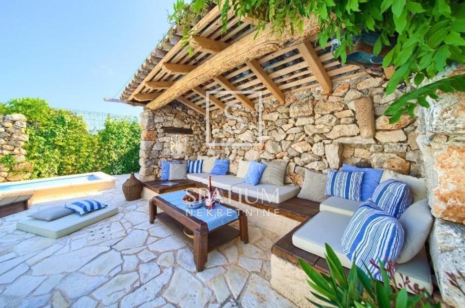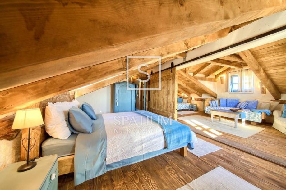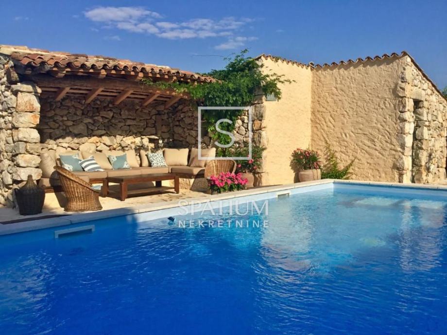 MALINSKA, u ponudu smo dobili rustikalnu kamenu vilu od 220 m2 s bazenom i pogledom na more. Prizemlje se sastoji od ulaznog prostora, kuhinje i blagovaone te prostranog dnevnog boravka s kaminom i izlazom na lođu. Na prvom katu se nalaze dvije spavaće sobe i kupaona. Svaka soba ima svoj izlaz na natkrivenu terasu, s koje se pruža prelijep panoramski pogled. U potkrovlju se nalaze još dvije spavaće sobe i kupaona. Interijer nekretnine u potpunosti je opremljen novim, kvalitetnim tehničkim uređajima i unikatno dizajniranim namještajem. Na prostranoj okućnici od 959 m2 nalazi se pomoćna zgrada, vinski podrum, bazen, kameni stol s klupama i roštilj te je na okućnici uređen prostor za tri parkirna mjesta. Vanjski prostor vile ograđen je kamenim zidovima i vrtom s mediteranskim biljem, uz automatizirani sustav navodnjavanja za grijanje vile moguće je koristiti toplinsku pumpu, kamin, podno grijanje u kupaonicama. Nekretnina je idealna prilika za bavljenje turističkom djelatnošću, kao i za dugoročan miran obiteljski život.