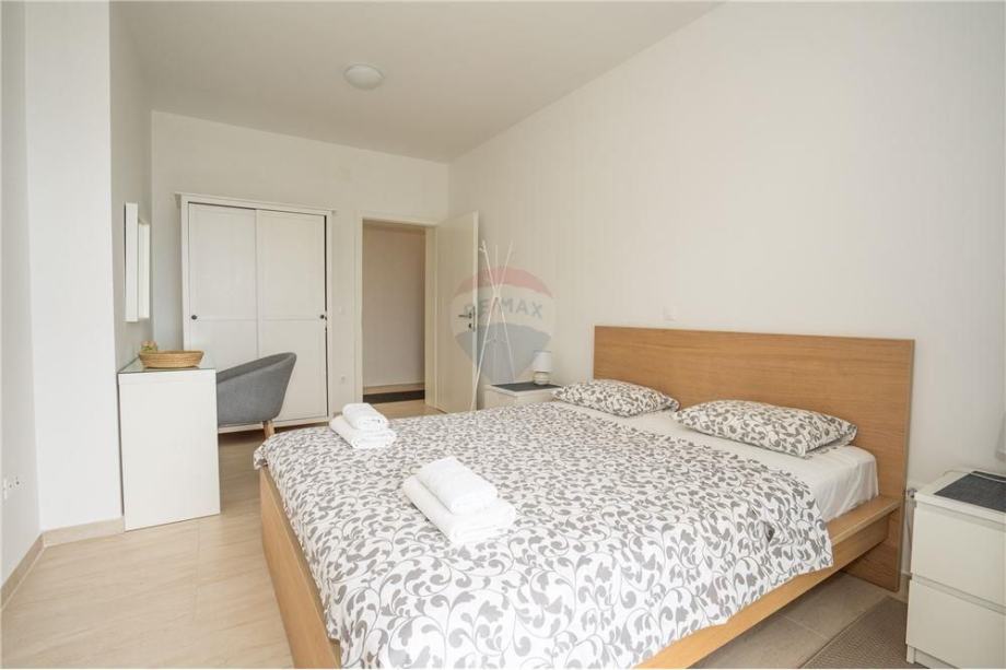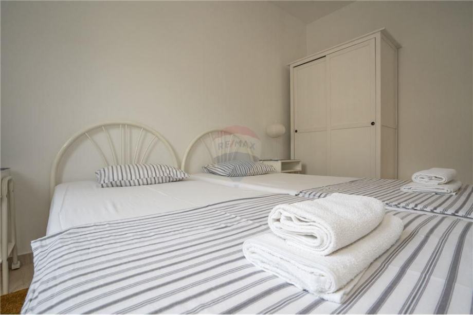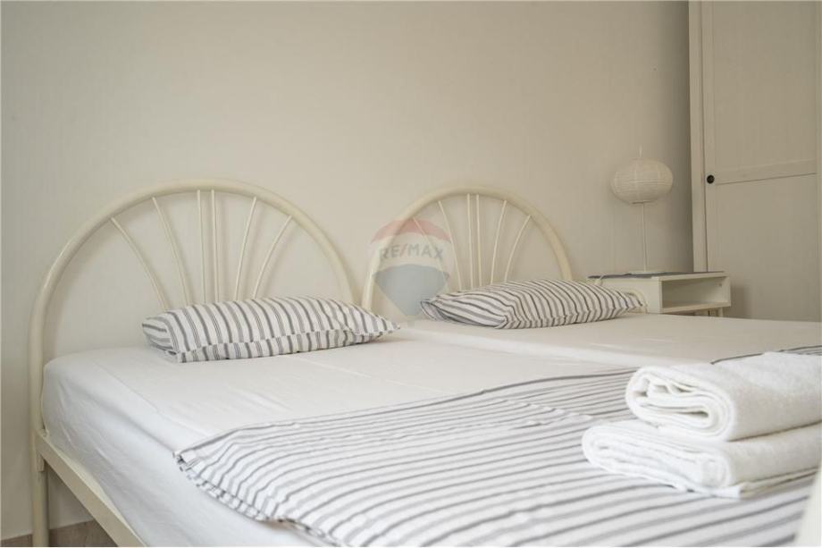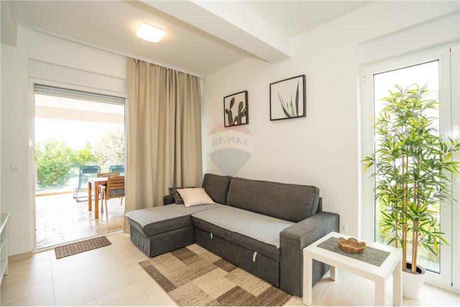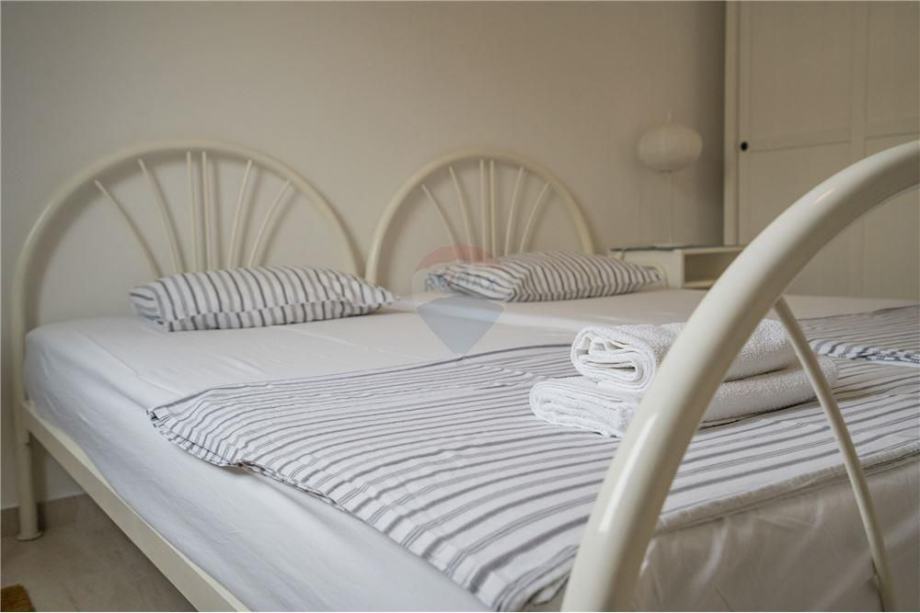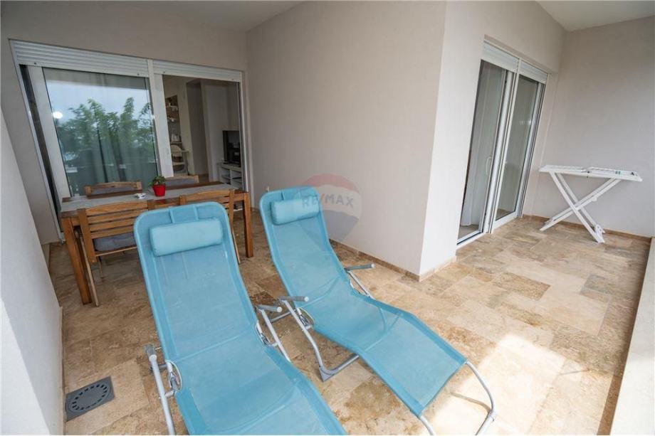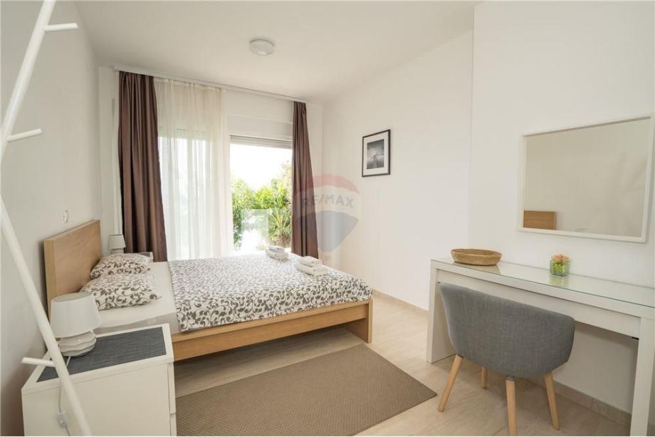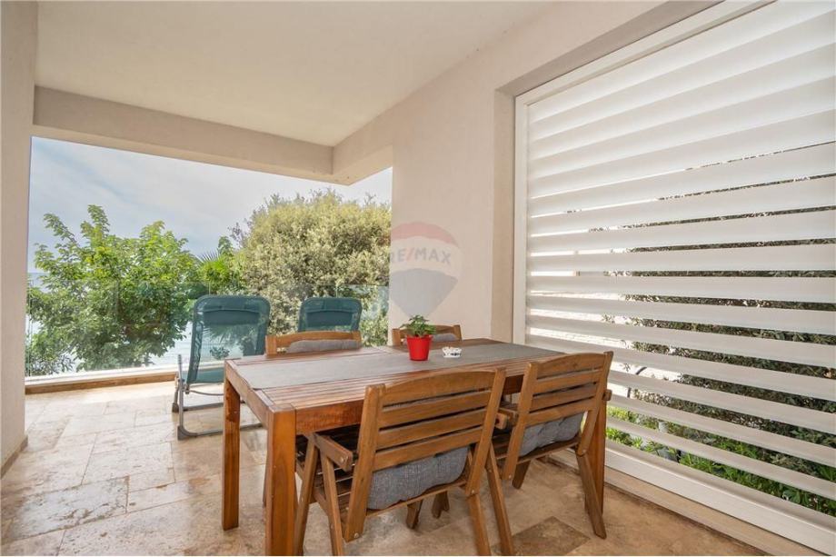 Prodaje se dvosoban stan u Mandrama PRVI RED DO MORA. Stan veličine 74,79m2 nalazi se na PRVOM katu stambene zgrade sa ukupno 9 jedinica. Sastoji se od ulaznog hodnika, DVIJE spavaće sobe, kuhinje/blagovaonice/dnevnog boravka, kupaonice i prostrane natkrivene terase. Ulazni hodnik odlično koncipiran, mogućnost postavljanja ugradbenog ormara za odlaganje stvari. Spavaća soba orijentirana prema zapadu ima izlaz na natkrivenu terasu. Stan se prodaje potpuno namješten, vanjska PVC stolarija sa automatskim podizačima. Stan je prostran i odlično osvijetljen sa zapadne i sjeverne strane. Vanjska terasa obložena vrhunskim kamenom, staklena ograda omogućava nesmetan pogled na more. Mogućnost ugradnje peći na drva ili pelete, klimatizirano.