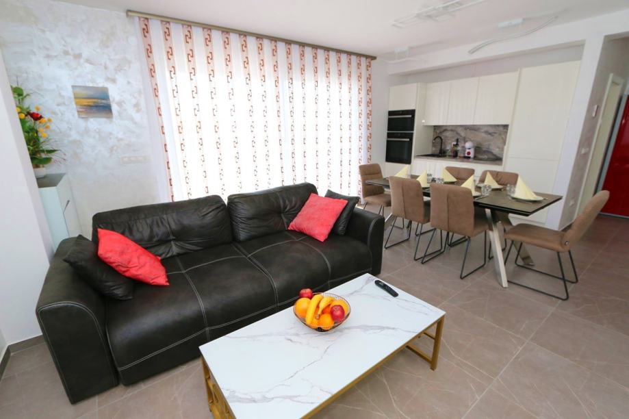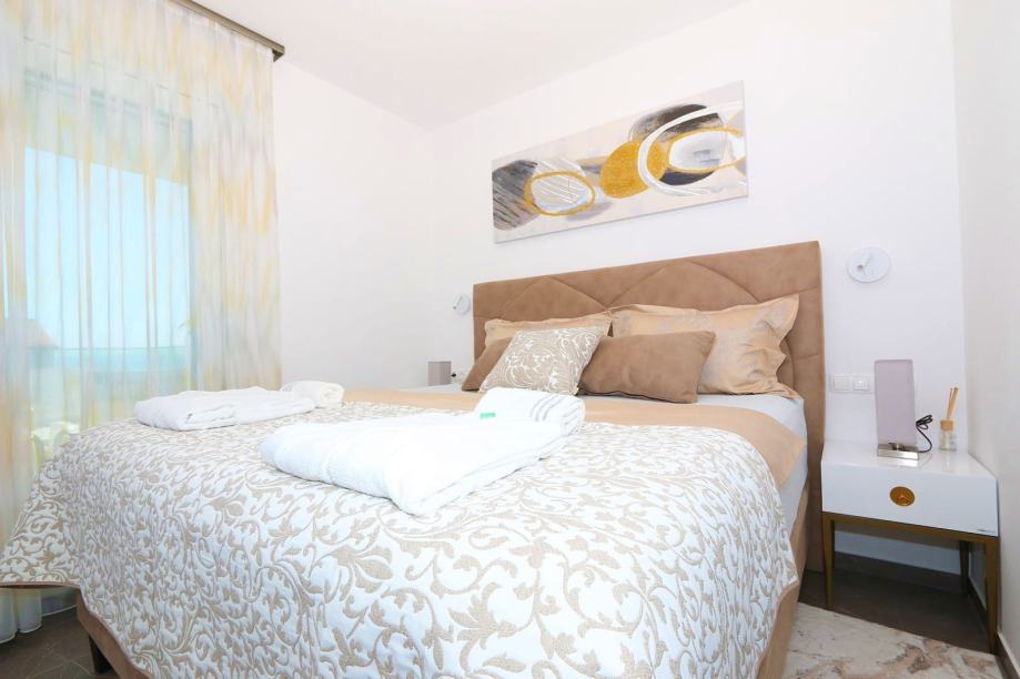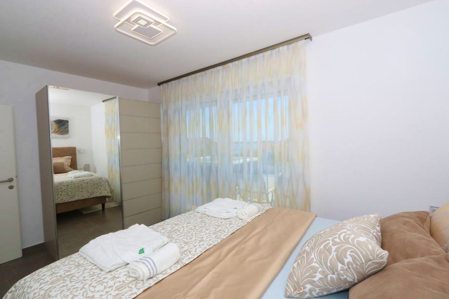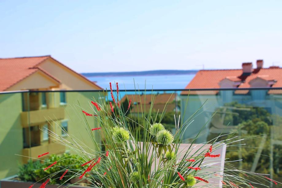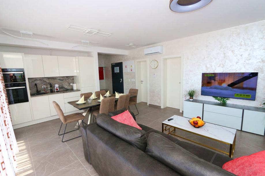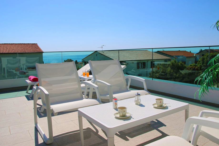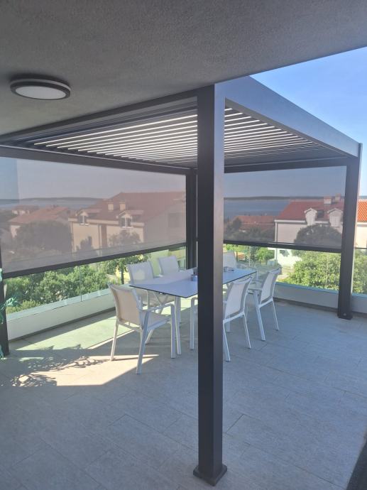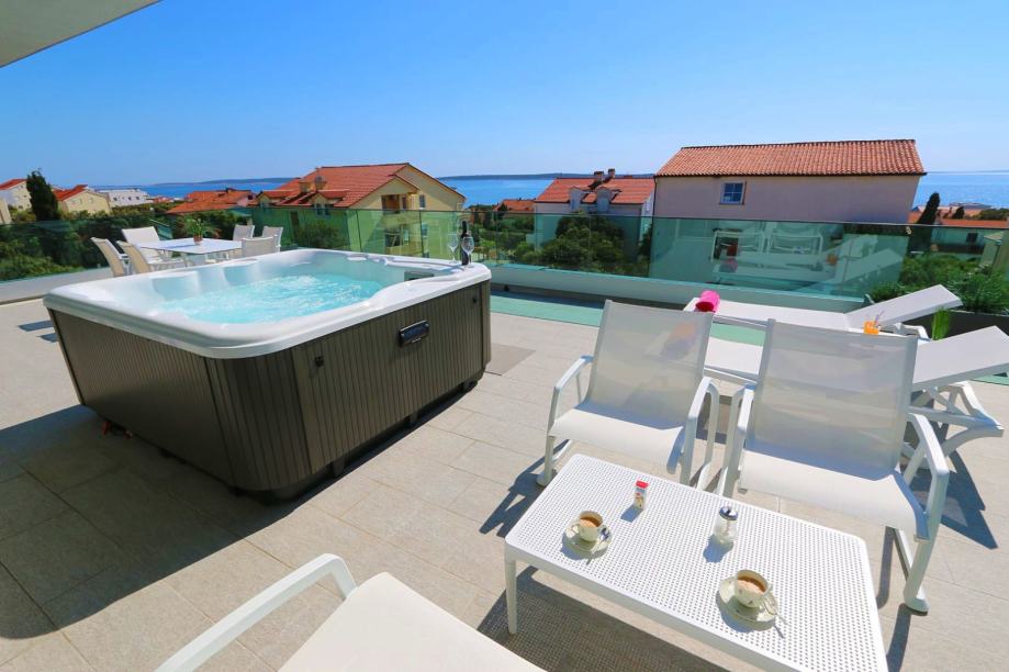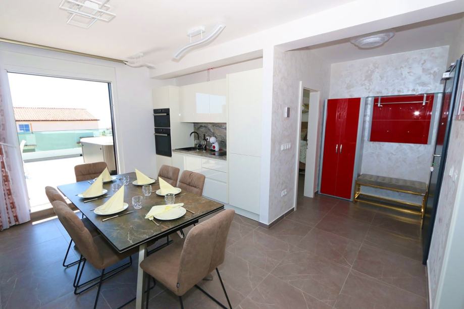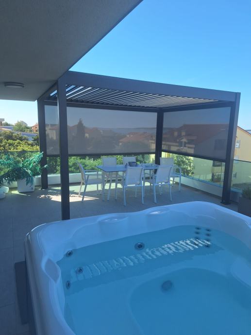 Prodaje se penthouse neto korisne površine 91,85 m2 s pogledom na more, potpuno namješten. Sastoji se od dnevnog boravka, blagovaonice i kuhinje, dvije spavaće sobe, dvije kupaonice, natkrivene terase, nenatkrivene terase te nenatkrivenog balkona, sveukupno neto korisne površine 85,85 m2. Stambenom prostoru pripadaju 2 parkirna mjesta, svaki ukupno neto korisne površine 3,00 m2. S terase se pruža prekrasan pogled na more, a na terasi se nalazi i hidromasažni bazen - jacuzzi te tenda.