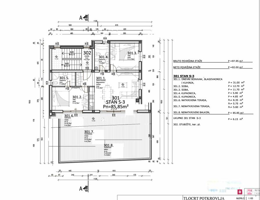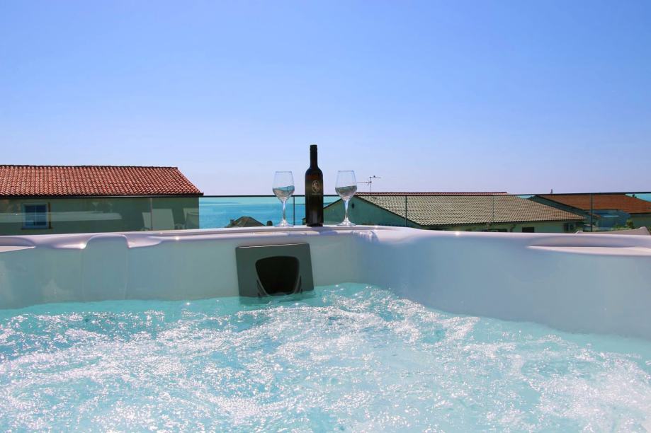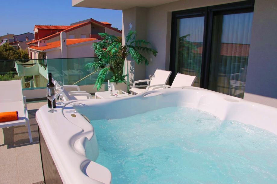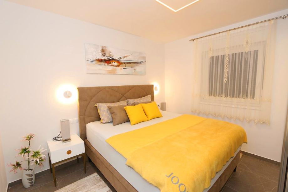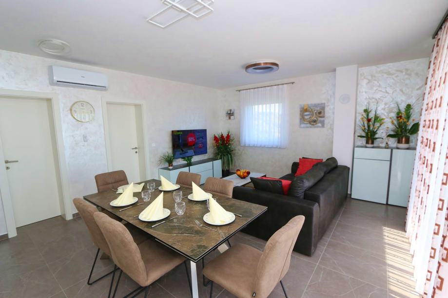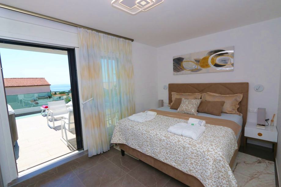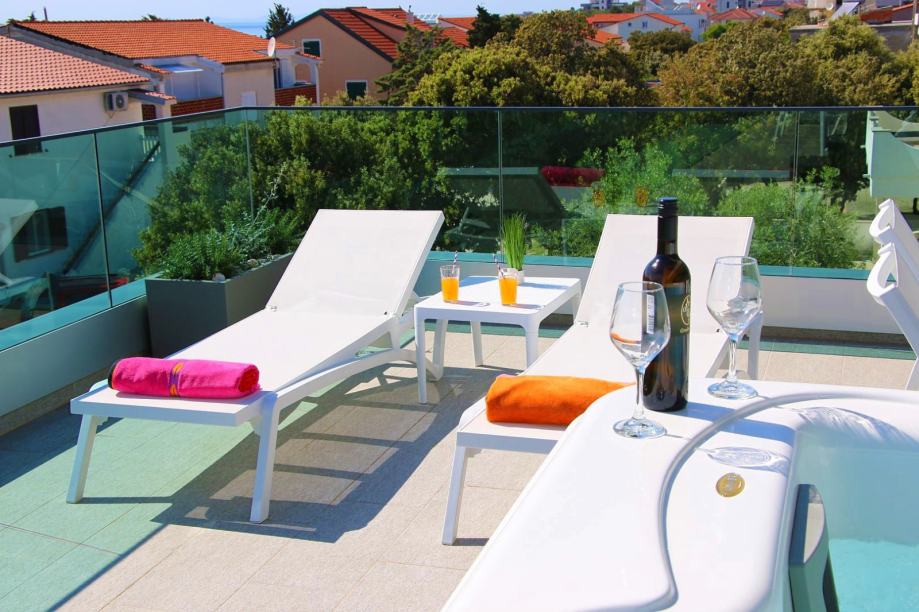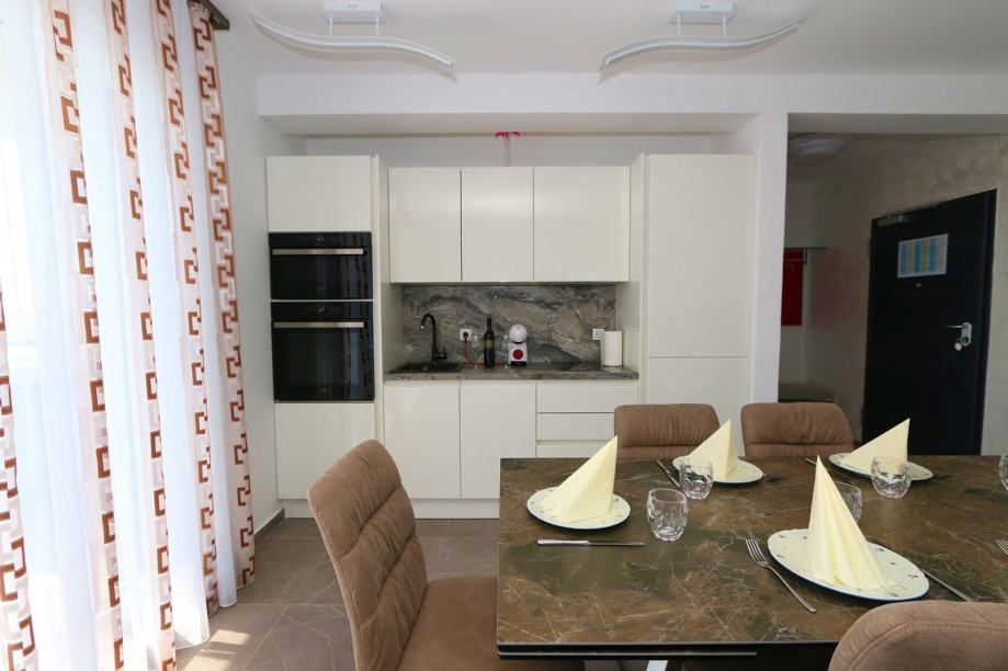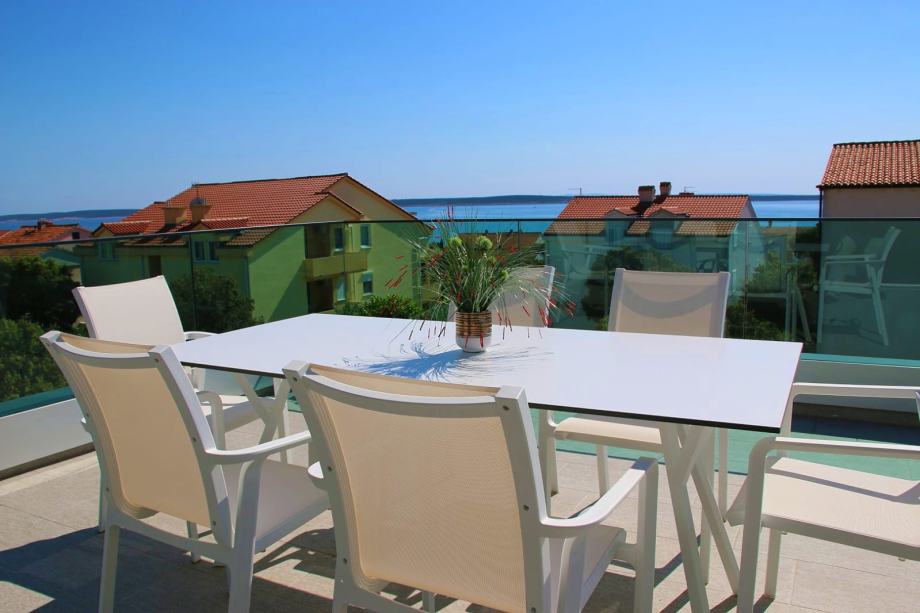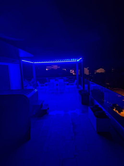 Prodaje se penthouse neto korisne površine 91,85 m2 s pogledom na more, potpuno namješten. Sastoji se od dnevnog boravka, blagovaonice i kuhinje, dvije spavaće sobe, dvije kupaonice, natkrivene terase, nenatkrivene terase te nenatkrivenog balkona, sveukupno neto korisne površine 85,85 m2. Stambenom prostoru pripadaju 2 parkirna mjesta, svaki ukupno neto korisne površine 3,00 m2. S terase se pruža prekrasan pogled na more, a na terasi se nalazi i hidromasažni bazen - jacuzzi te tenda.