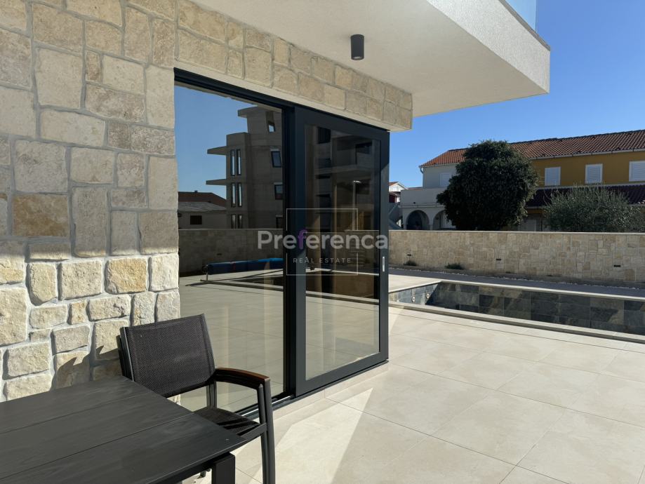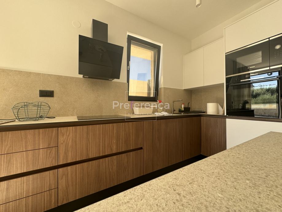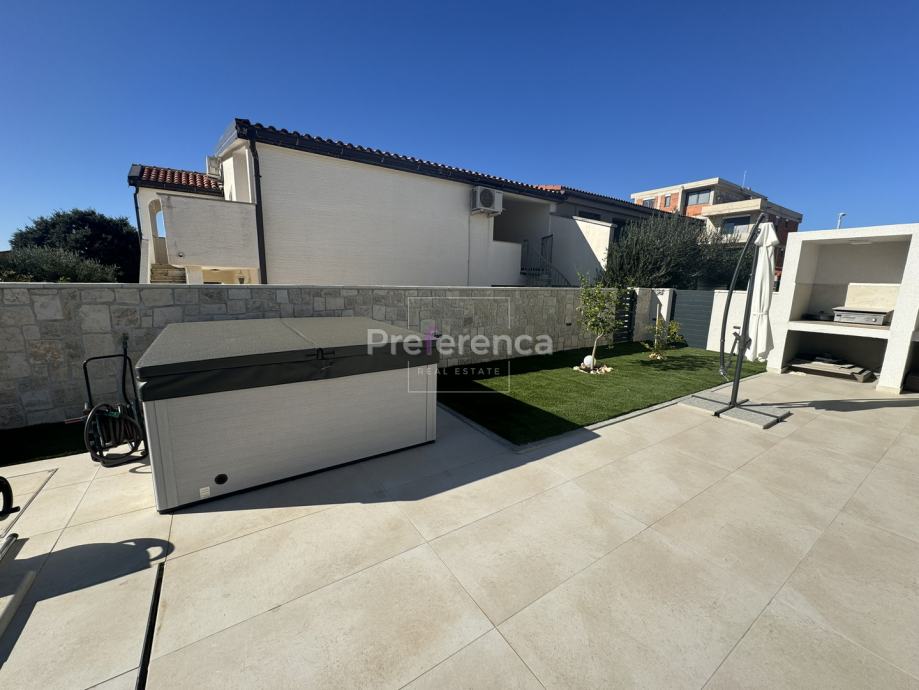 Prodaje se luksuzna villa s bazenom u Mandrama na otoku Pagu. Vila (dvojni objekt) površine 220m2 sagrađena je na parceli od 475m2 i sastoji se od prizemlja i kata. U prizemlju vile nalazi se kuhinja sa blagovaonicom i dnevnim boravkom, spavaća soba s kupaonicom, kupaonica i spremište. Unutarnje stepenice vode do kata gdje se nalaze tri spavaće sobe s kupaonicama. Villa je opremljena vrhunskim namještajem, Daikin dizalica topline osigurava grijanje vile putem podnog grijanja i hlađenje sa jedinicama u svakoj prostoriji. Vrhunska troslojna stolarija u antracit boji sa komarnicima u svim prostorijama, luksuzne Marazzi keramičke pločice u kupaonicama i terasama. U dvorištu se nalazi bazen obložen keramičkim pločicama sa grijanjem i jacuzzi za 6 osoba.