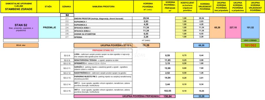 Ukupna neto korisna površina apartmana sa svim pripadcima iznosi 101,52 m². Stan S2 nalazi se na jugoistočnoj strani zgrade i ima djelomičan pogled na more.