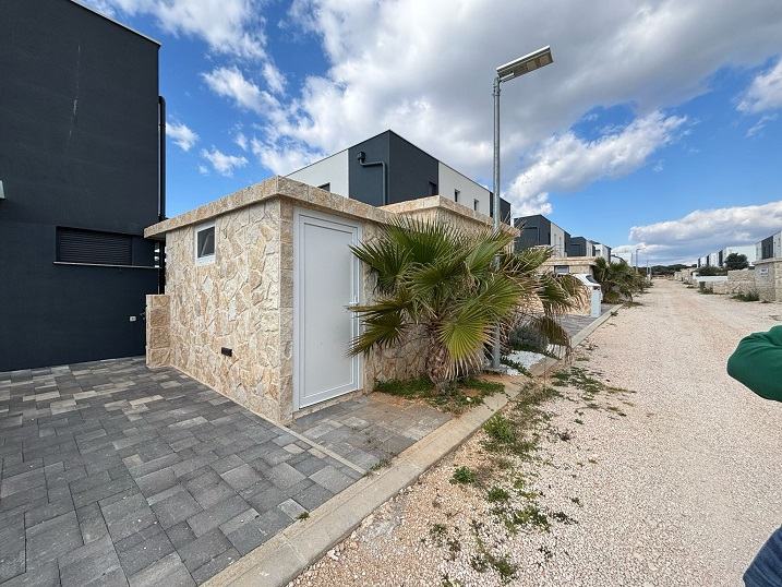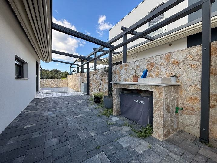 Sastoji se u prizemlju od ulaznog prostora, WC-a, spremišta, kuhinje s dnevnim boravkom i blagovaonom te terase sa električnom, sklopivom nadstrešnicom.