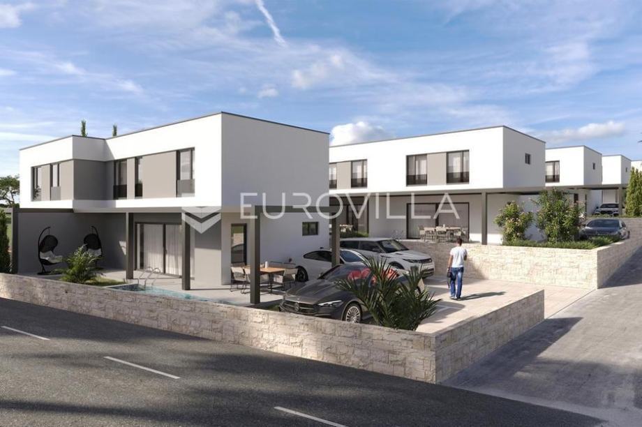 Mandre, u samom srcu najljepše ulice smjestio se stan S1 u trojnoj Vili 2- pažljivo projektiran dom s ukupno 87,60 m² zatvorenog stambenog prostora, raspoređenog kroz dvije etaže.Donja etaža prizemlja obuhvaća dnevni boravak, kuhinju i blagovaonicu otvorenog koncepta - 31.80 m², kupaonicu -5.10 m², hodnik - 3.20 m² i spremište - 3.40 m². Ukupno prizemlje: 43.50 m²Na katu se nalaze tri spavaće sobe - 10.90 m², 10.10 m², 8.50 m², dodatna kupaonica - 4.50 m² i hodnik sa stubištem - 10.10 m². Ukupno kat: 44.10 m²Stan krase francuski balkoni, koji omogućuju obilje prirodne svjetlosti i povezanost s vanjskim prostorom. Ugrađuje se dvobojna PVC stolarija dvobojna (antracit izvana bijela iznutra), aluminijske rolete s termoizolacijom, a u svakoj prostoriji predviđena je zasebna klima jedinica s funkcijom grijanja i hlađenja.Unutrašnjost prostora krase prvoklasne podne i zidne obloge, staklene tuš kabine te moderne sanitarije minimalističkog dizajna. Vanjski izgled odlikuje se suvremenim linijama i toplim detaljima poput kamenih zidova u dvorištu, zelenih površina i natkrivenih terasa.Cijeli kompleks zamišljen je kao funkcionalna cjelina s naglaskom na sigurnost, udobnost i estetiku - uključujući video nadzor, termo fasadu debljine 8 cm, široke pristupne staze i kvalitetno uređene popločane površine.Stan S1 nudi i impresivan privatni eksterijer:Bazen dimenzija 6×3 m (18 m²)Vlastito dvorište i sunčalište od 55 m²Dva privatna parkirna mjesta (ukupno 25 m²)Terasa za uživanje na otvorenomPovršina ukupnog vanjskog prostora iznosi oko 98 m², što u kombinaciji sa zatvorenim dijelom daje vrhunski životni ugođaj na 136,6 m2 u mirnom i zelenom ambijentu.Za dodatno više informacija stojimo na raspolaganju....