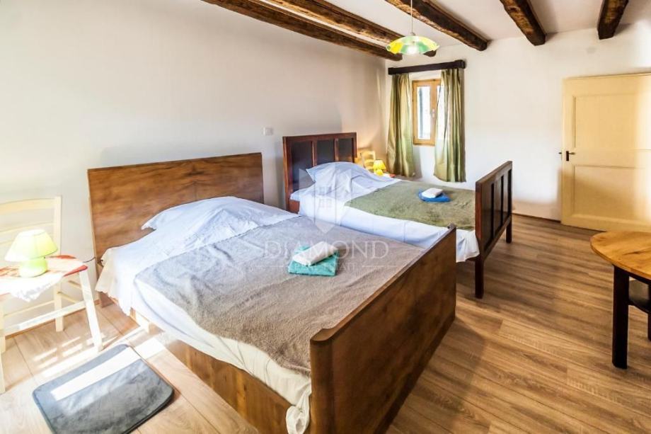 Na mirnoj lokaciji u Marčani, prodaje se adaptirana kuća u tradicionalnom istarskom stilu, gdje dominiraju prirodni materijali poput drva i kamena.