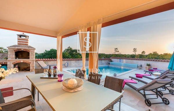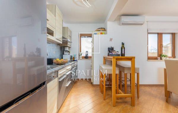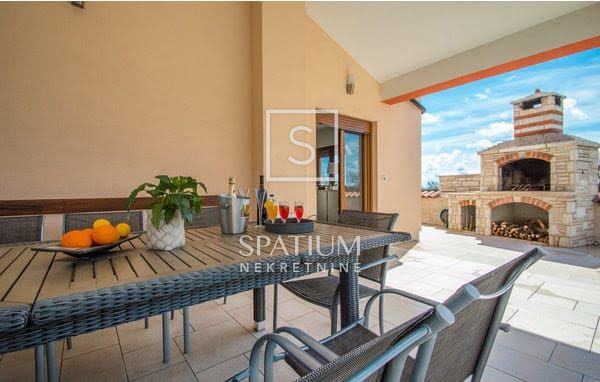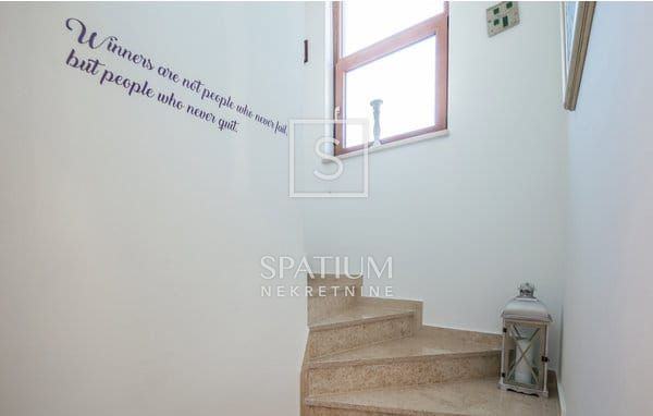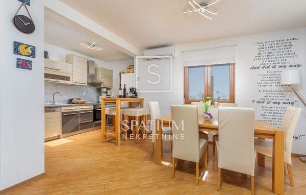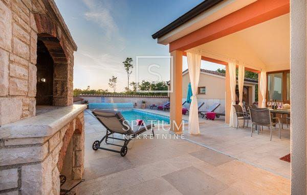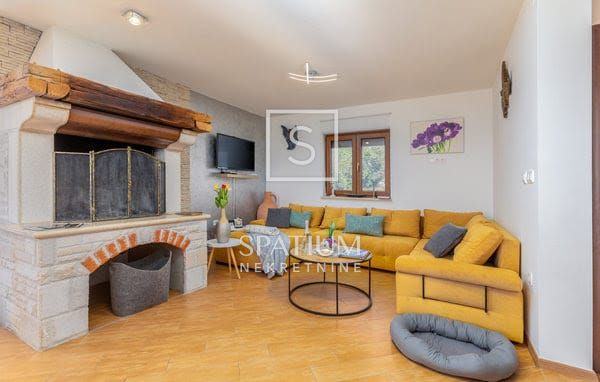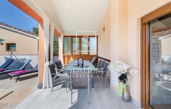 Prizemlje se sastoji od ulaznog hodnika, kupaonice, open - space kuhinje s blagovaonicom i dnevnog boravka iz kojega se izlazi na prostranu natkrivenu terasu i vrt s grijanim bazenom. Na kat se dolazi unutarnjim stepeništem gdje su se smjestile četiri spavaće sobe, kupaonica te prostrana terasa s otvorenim pogledom na prirodu i zelenilo. Podno grijanje je postavljeno u svim prostorijama te je nekretnina kompletno klimatizirana. Uz bazen, nalaze se i sunčalište, roštilj, garaža te još nekoliko parkirnih mjesta. Nekretnina je kategorizirana i nalazi se u turističkom najmu, vrlo uspješno već nekoliko godina.