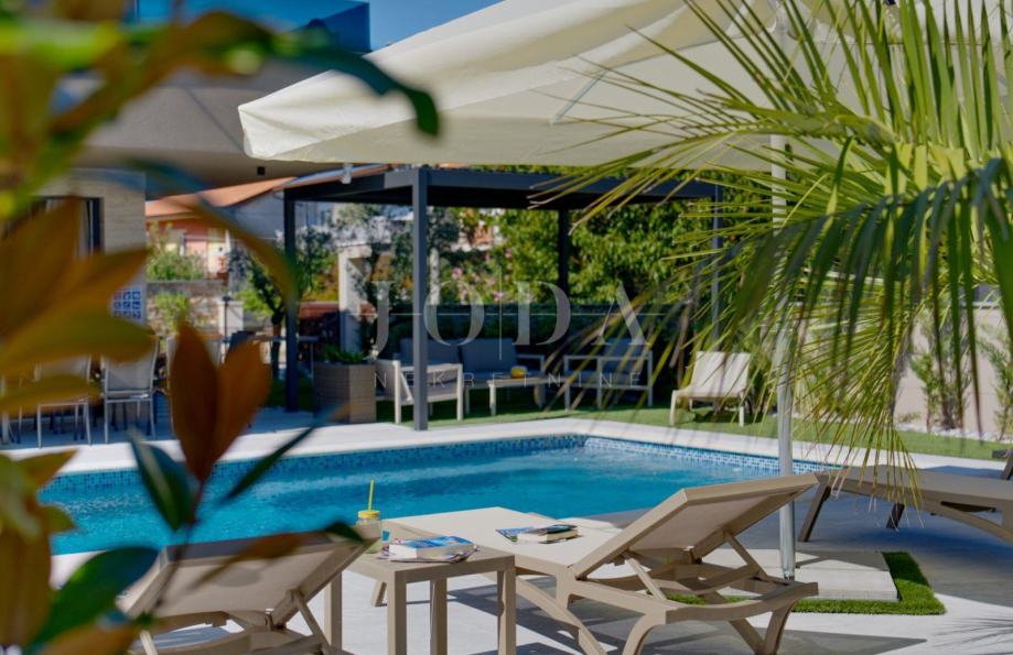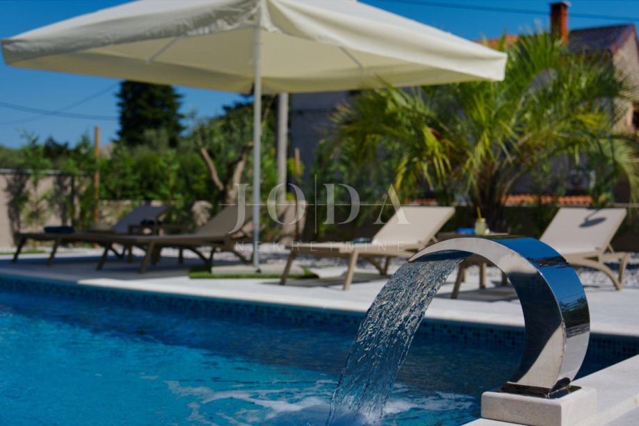 Na uređenoj okućnici nalazi se bazen sa vodopadom, sunčalište, te ljetna kuhinja.