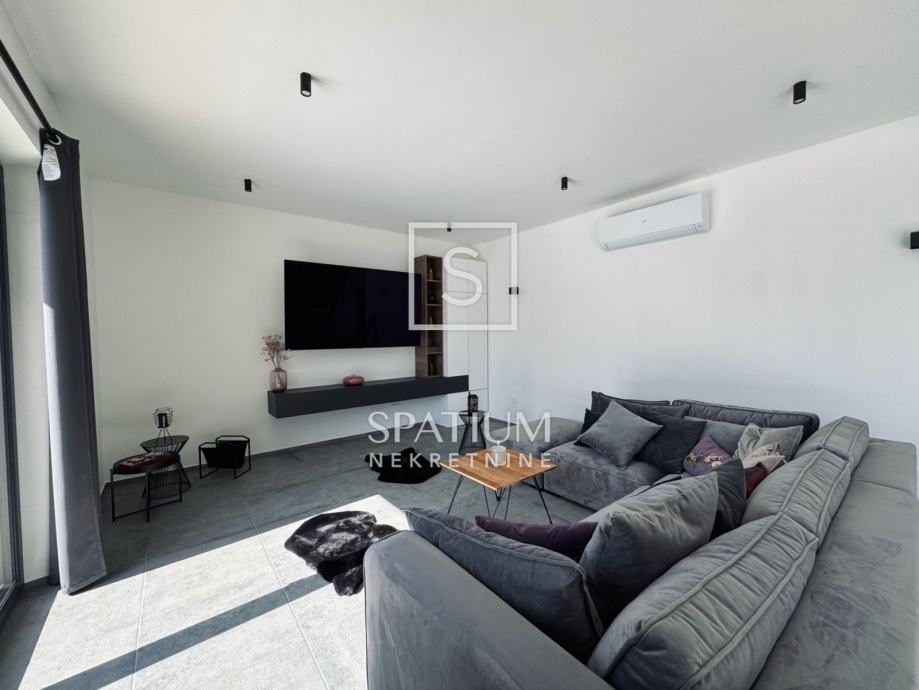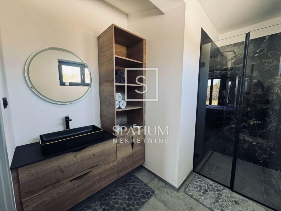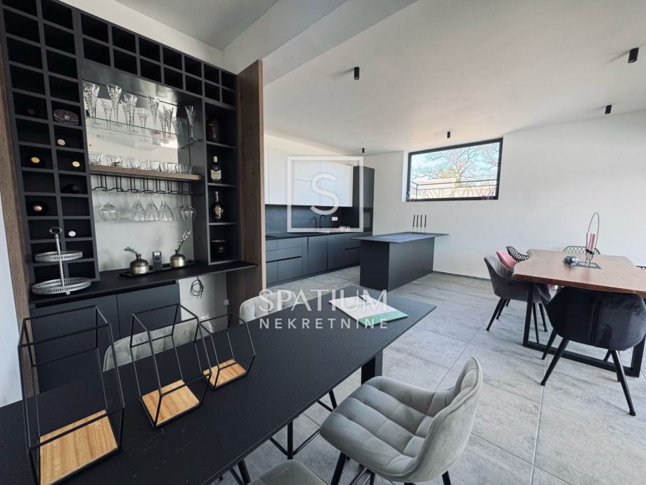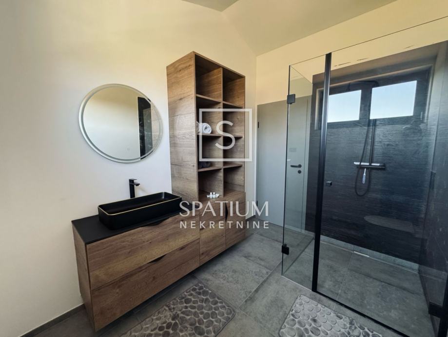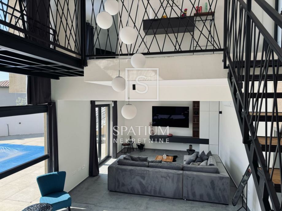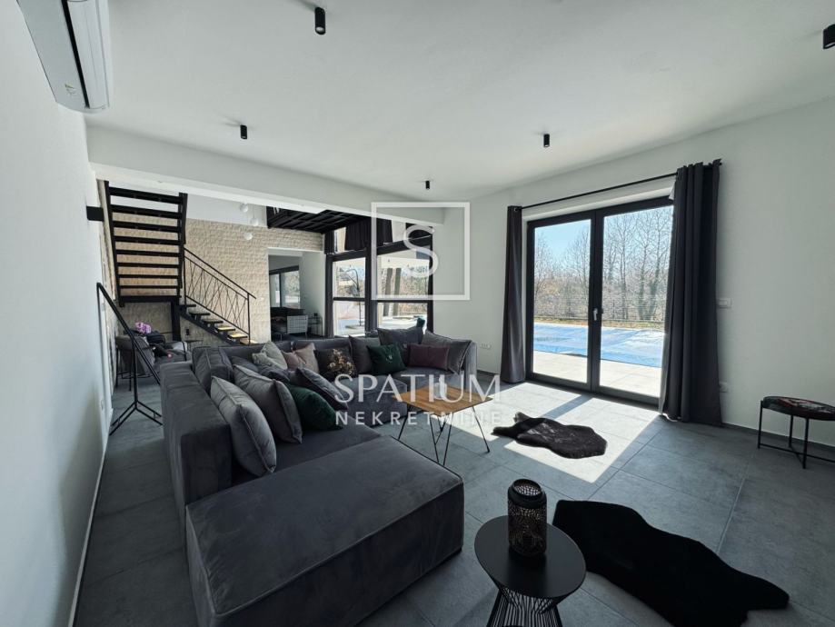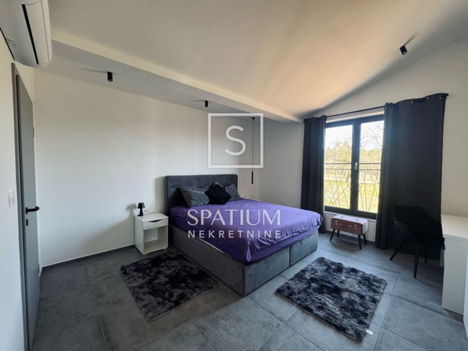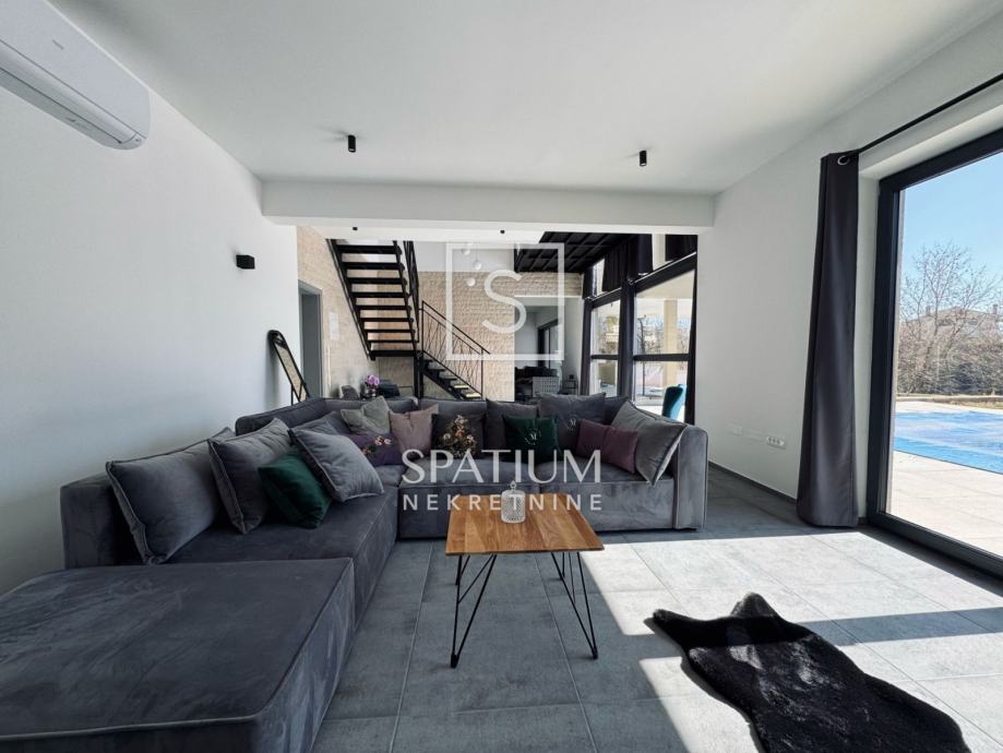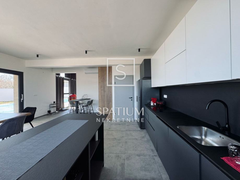MARČANA, u ponudi imamo prekrasnu modernu vilu smještenu u mirnom okruženju nedaleko od Marčane. Vila se nalazi na parceli od 664 m². Vila se sastoji od suterena i prizemlja ukupne površine 268 m². U suterenu se nalaze svijetli ulazni hodnik, ostava, toalet, kuhinja s blagovaonicom, prostrani dnevni boravak s izlazom na natkrivenu terasu i bazen od 36 m², kao i strojarnica za bazen. Na katu su smještene tri spavaće sobe, svaka s vlastitom kupaonicom, te praonica rublja. Vila je klimatizirana, ima uređeni vrt, parking za 2–3 automobila i prodaje se potpuno opremljena i namještena.