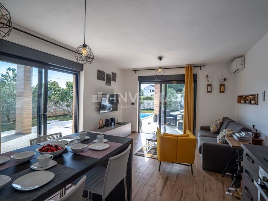 Kuća s sastoji od otvorenog dnevnog boravka s kuhinjom i blagovaonicom, dvije spavaće sobe (od kojih jedna ima vlastitu kupaonicu), dodatnu kupaonica u prostoru kuće, prostran hodnik, ostava i dvije natkrivene terase pored bazena. Cjelokupan prostor je klimatiziran s tri klima uređaja, a objekt posjeduje energetski certifikat razreda A.