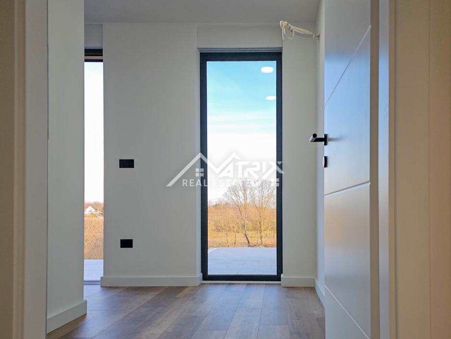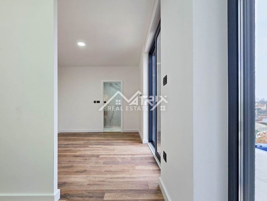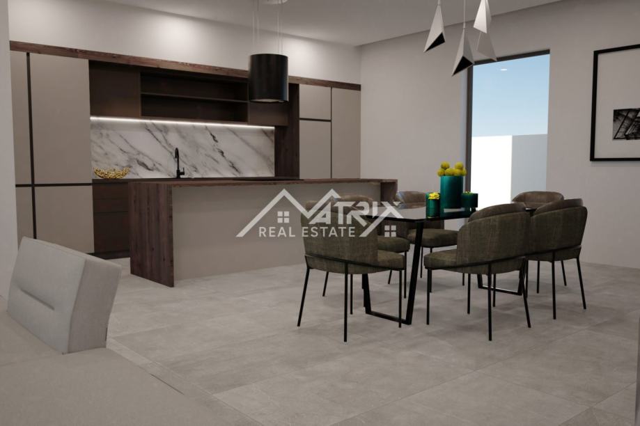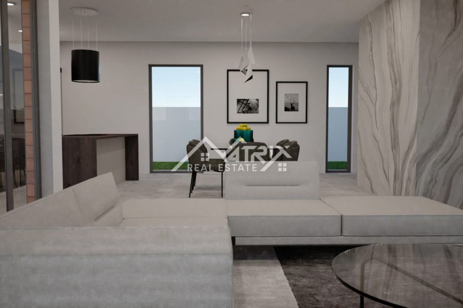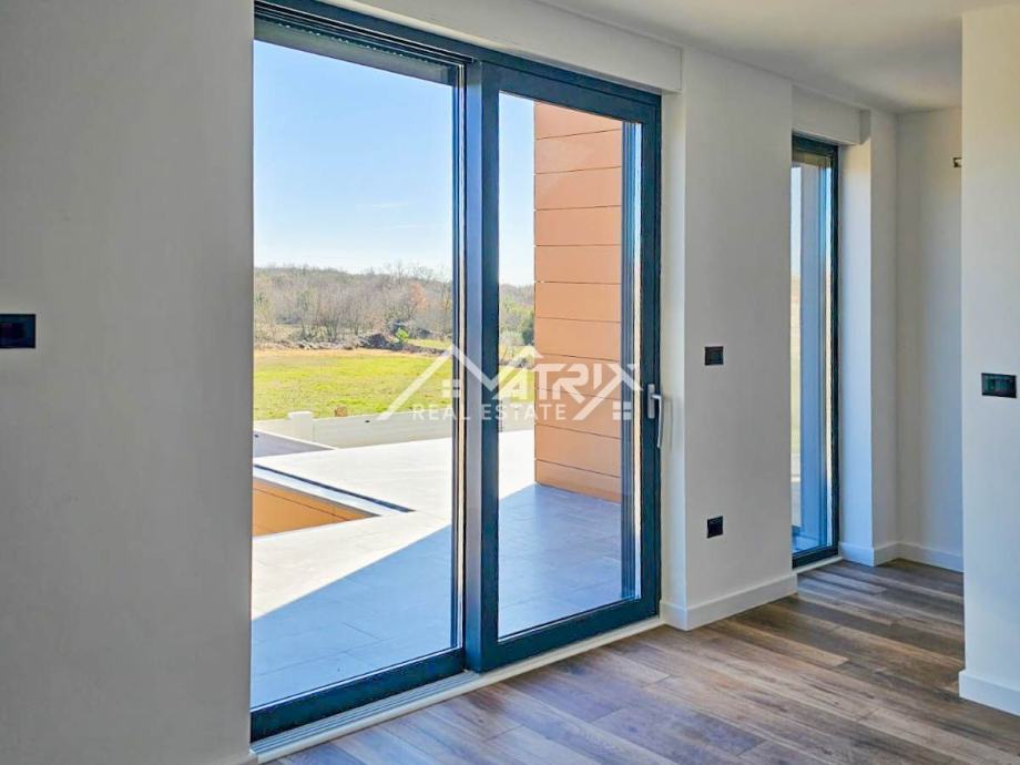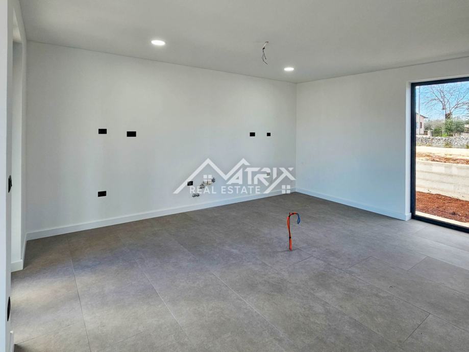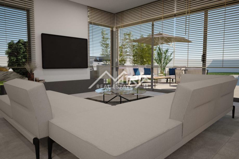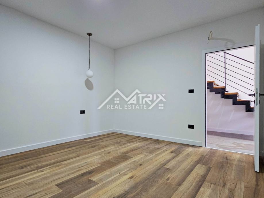 Ova samostojeća vila se prostire na dvije etaže, prizemlje i prvi kat. Centralni dio prizemlja veliki "open space" prostor koji ujedinjuje dnevni boravak s blagovaonicom i potpuno opremljenom kuhinjom. Iz open-space prostora se na terasu bazena izlazi kroz velike staklene stijene koje omogućuju obilje prirodnog svjetla kroz cijeli dan. U prizemlju se još nalazi i spavaća soba s kupaonicom, spremište/vešeraj, te wc za goste. Pristup prvom katu omogućen je unutarnjim stubištem. Na katu se nalaze dvije komforne spavaće sobe od kojih svaka ima vlastitu kupaonicu. Obje spavaće sobe imaju izlaz na natkrivenu terasu.