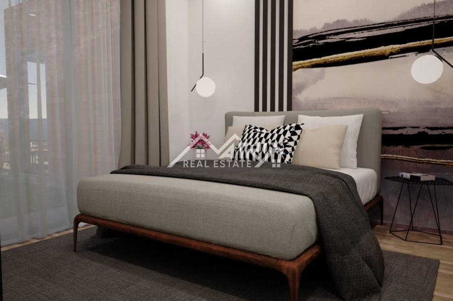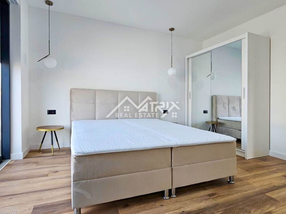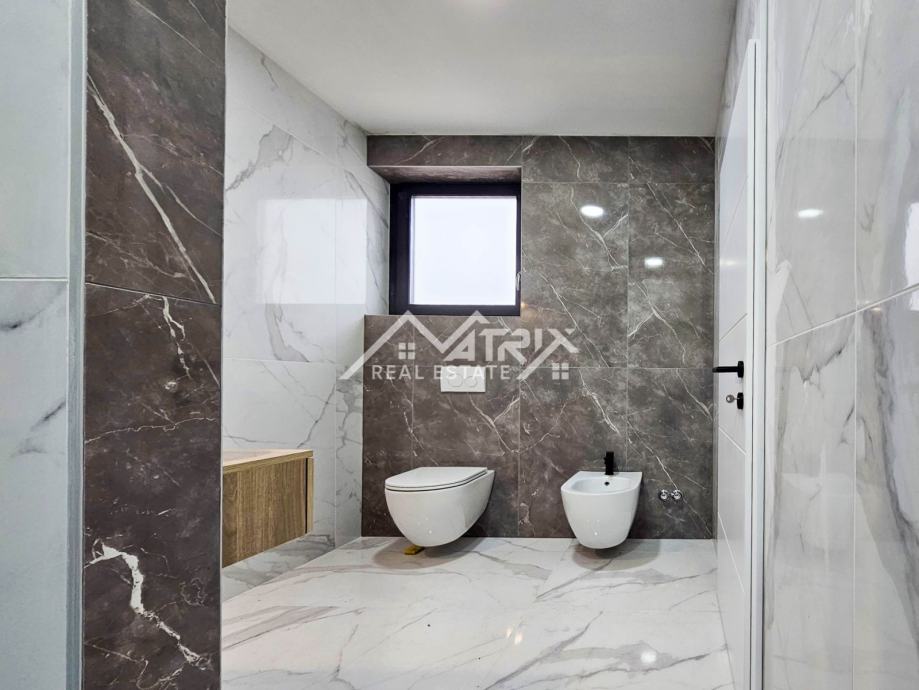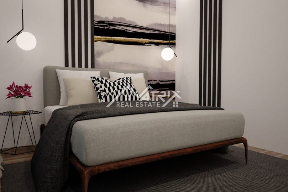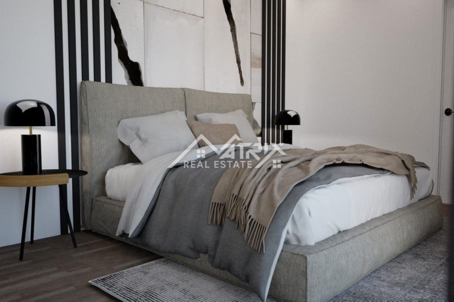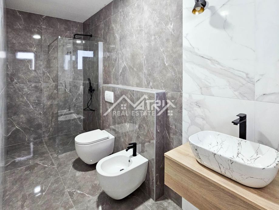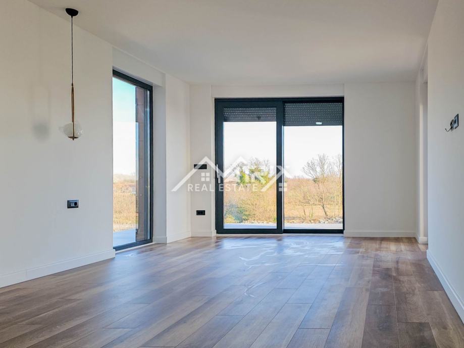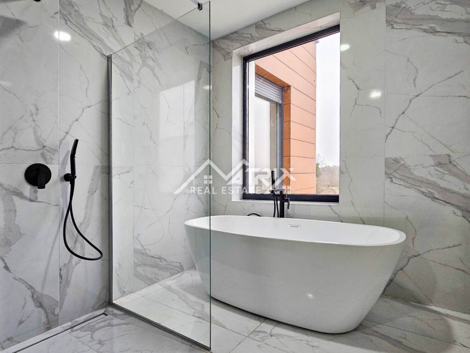 Ova samostojeća vila se prostire na dvije etaže, prizemlje i prvi kat. Centralni dio prizemlja veliki "open space" prostor koji ujedinjuje dnevni boravak s blagovaonicom i potpuno opremljenom kuhinjom. Iz open-space prostora se na terasu bazena izlazi kroz velike staklene stijene koje omogućuju obilje prirodnog svjetla kroz cijeli dan. U prizemlju se još nalazi i spavaća soba s kupaonicom, spremište/vešeraj, te wc za goste. Pristup prvom katu omogućen je unutarnjim stubištem. Na katu se nalaze dvije komforne spavaće sobe od kojih svaka ima vlastitu kupaonicu. Obje spavaće sobe imaju izlaz na natkrivenu terasu.