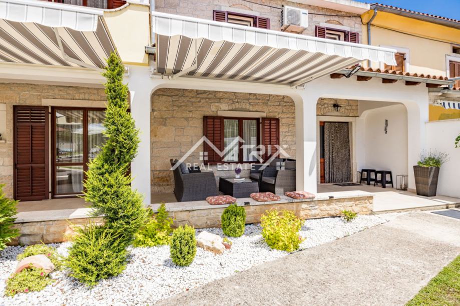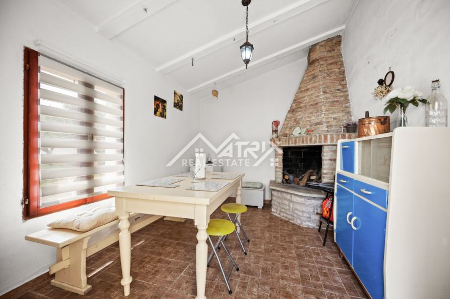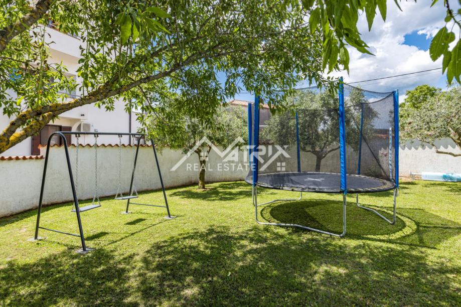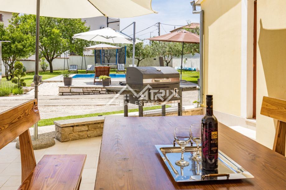 Okućnica kuće potpuno je ograđena i nudi potpunu privatnost. Na raspolaganju je bazen sa sunčalištem, terasa s vanjskim blagovaonskim prostorom i roštiljem, te ljuljačke za najmlađe. Posebna vrijednost nekretnine je tradicionalna istarska konoba uz kuću – opremljena rustikalnim kaminom i prostorom za druženje, savršena za večeri s prijateljima ili obitelji. Uz sve to, kuća posjeduje i garažu, što dodatno povećava funkcionalnost i sigurnost.