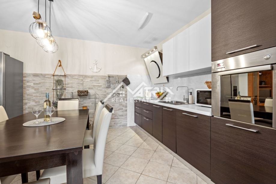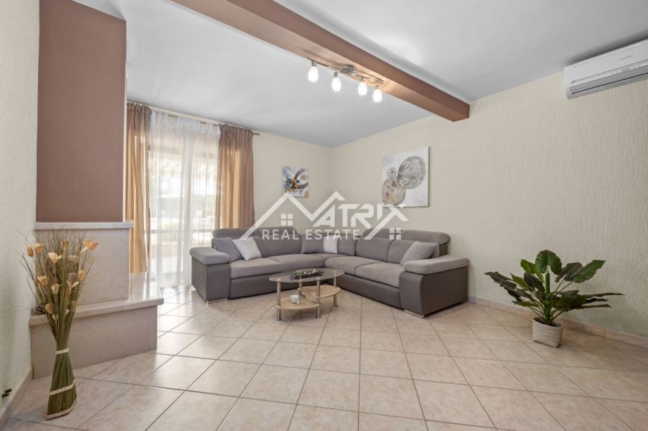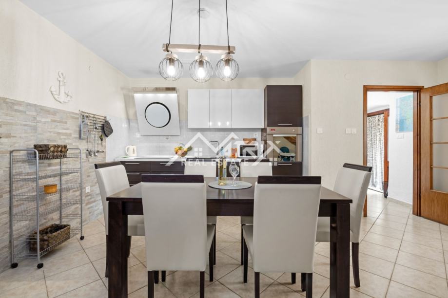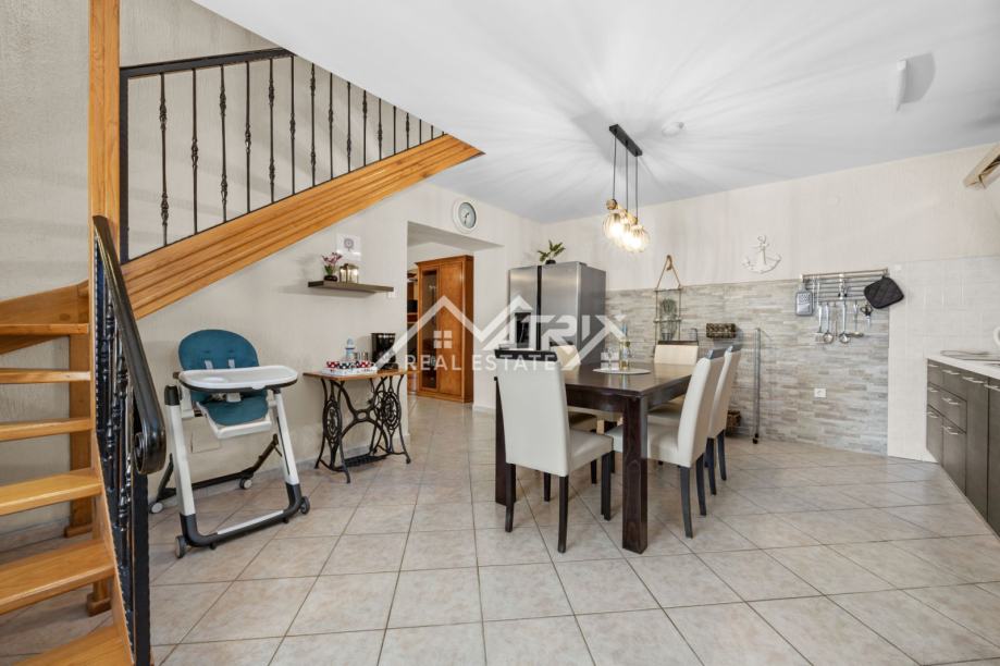 U prizemlju kuće nalazi se prostrani dnevni boravak s kutnom garniturom i kaminom, stvarajući topao ambijent za obiteljska okupljanja. Otvorena kuhinja potpuno je opremljena svim potrebnim uređajima i povezana s blagovaonicom, a na istoj etaži nalazi se i moderno uređena kupaonica s tušem.