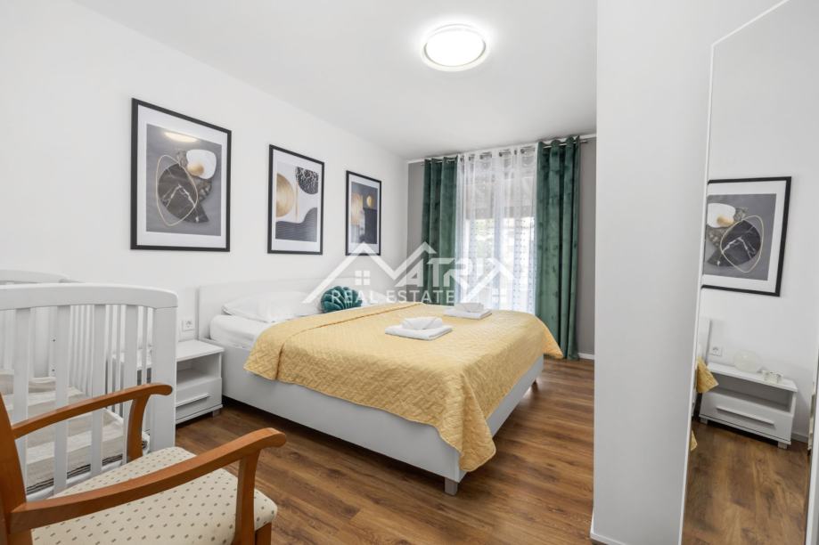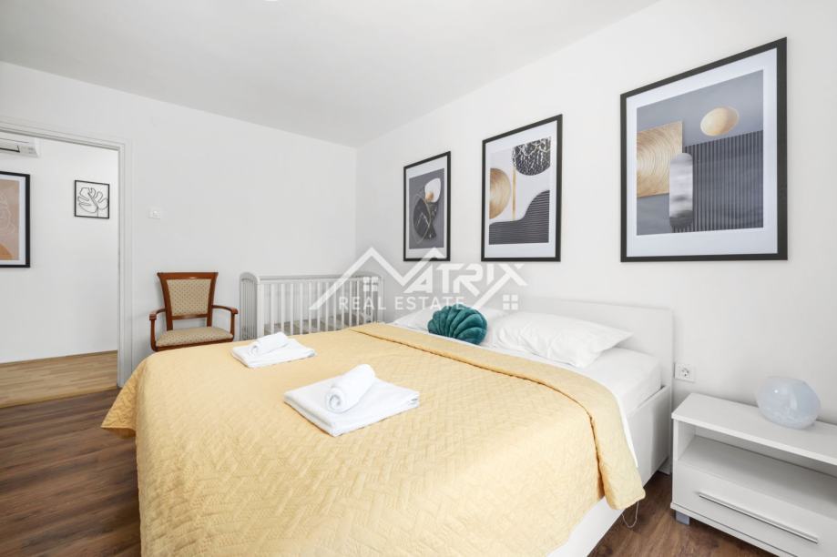Na katu su smještene tri udobne spavaće sobe – jedna s izlazom na terasu s koje se pruža opuštajući pogled na okolnu prirodu, dok je jedna od soba dodatno opremljena radnim kutkom, idealnim za miran rad od kuće. Kat ima i drugu kupaonicu, opremljenu kadom, što dodatno doprinosi komforu za veće obitelji ili goste.