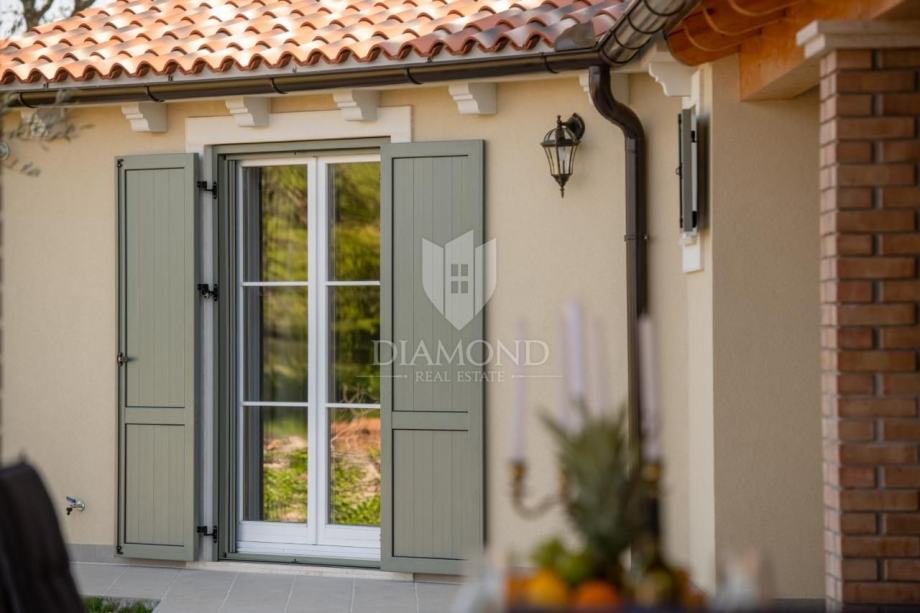 U prizemlju očarati će vas prostrani open space dnevni boravak s kuhinjom, blagovaonski stol, gostinjski WC, dvije luksuzne spavaće sobe s vlastitim kupaonicama te izlaz na predivnu natkrivenu terasu s roštiljem. U dvorištu se nalazi prekrasan bazen s slanom vodom, hidromasažna kada pokraj bazena, sunčalište okruženo zelenilom, te igralište za djecu pokraj bazena.