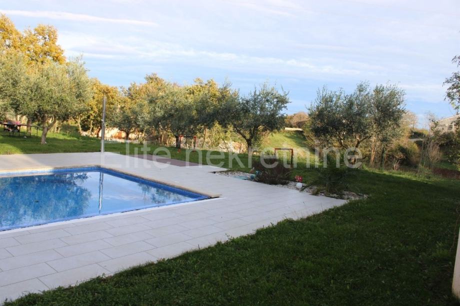 Okućnicu kuće od 1650 m2 krasi bazen površine 32 m2 s sunčalištem, prostrana okućnica koju se može iskoristiti popratnim sportskim sadržajima po želji budućeg vlasnika ( trenutno- stolni tenis i mali nogomet) i terase na kojoj se nalazi ljetna kuhinja s kaminom .